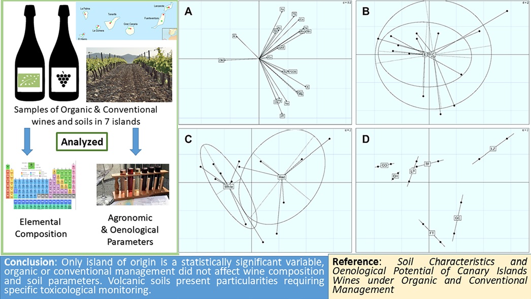 The Canary Islands are a Spanish archipelago of volcanic origin in the Atlantic Ocean near the Saharan coast. The extensive intricacy and multitude of variables inherent in the Canary Islands winemaking tradition have posed a substantial challenge, preventing comprehensive research on the main factors contributing to the character of local wine, thus, far. This challenge arises from a convergence of factors including the presence of 14 different grape varieties, and radically different climatic, soil and geographic conditions. This investigation sought to start unraveling this complexity by discerning the impacts of various geographical (specifically, island-related) and management factors (namely, organic vs. conventional practices) on soils and wines within the Canary Islands. Additional variables, such as wine type (red and white) and island of origin, were explored and correlated with the chosen management system. Pairs of organic and conventional wine and soil samples, possessing similar characteristics, were systematically collected from each of the seven wine-producing islands in the Canary archipelago. An examination of elemental composition, oenological attributes and fertility parameters was conducted, followed by comprehensive statistical analysis. Among the variables examined, only the island of origin emerged as statistically significant within the sample. Concerning soil fertility, organic samples exhibited elevated levels of organic matter compared to their conventional counterparts. No notable disparities were observed between the two production methods in terms of soil metal composition and other fertility parameters. However, it is noteworthy that four soil samples surpassed the legally permissible limits for Nickel (Ni) and Mercury (Hg), with three of these instances originating from Lanzarote.
