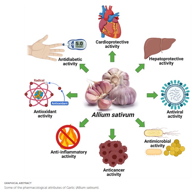 Allium sativum L. (Garlic) is a fragrant herb and tuber-derived spice that is one of the most sought-after botanicals, used as a culinary and ethnomedicine for a variety of diseases around the world. An array of pharmacological attributes such as antioxidant, hypoglycemic, anti-inflammatory, antihyperlipidemic, anticancer, antimicrobial, and hepatoprotective activities of this species have been established by previous studies. A. sativum houses many sulfur-containing phytochemical compounds such as allicin, diallyl disulfide (DADS), vinyldithiins, ajoenes (E-ajoene, Z-ajoene), diallyl trisulfide (DATS), micronutrient selenium (Se) etc. Organosulfur compounds are correlated with modulations in its antioxidant properties. The garlic compounds have also been recorded as promising immune-boosters or act as potent immunostimulants. A. sativum helps to treat cardiovascular ailments, neoplastic growth, rheumatism, diabetes, intestinal worms, flatulence, colic, dysentery, liver diseases, facial paralysis, tuberculosis, bronchitis, high blood pressure, and several other diseases. The present review aims to comprehensively enumerate the ethnobotanical and pharmacological aspects of A. sativum with notes on its phytochemistry, ethnopharmacology, toxicological aspects, and clinical studies from the retrieved literature from the last decade with notes on recent breakthroughs and bottlenecks. Future directions related to garlic research is also discussed.