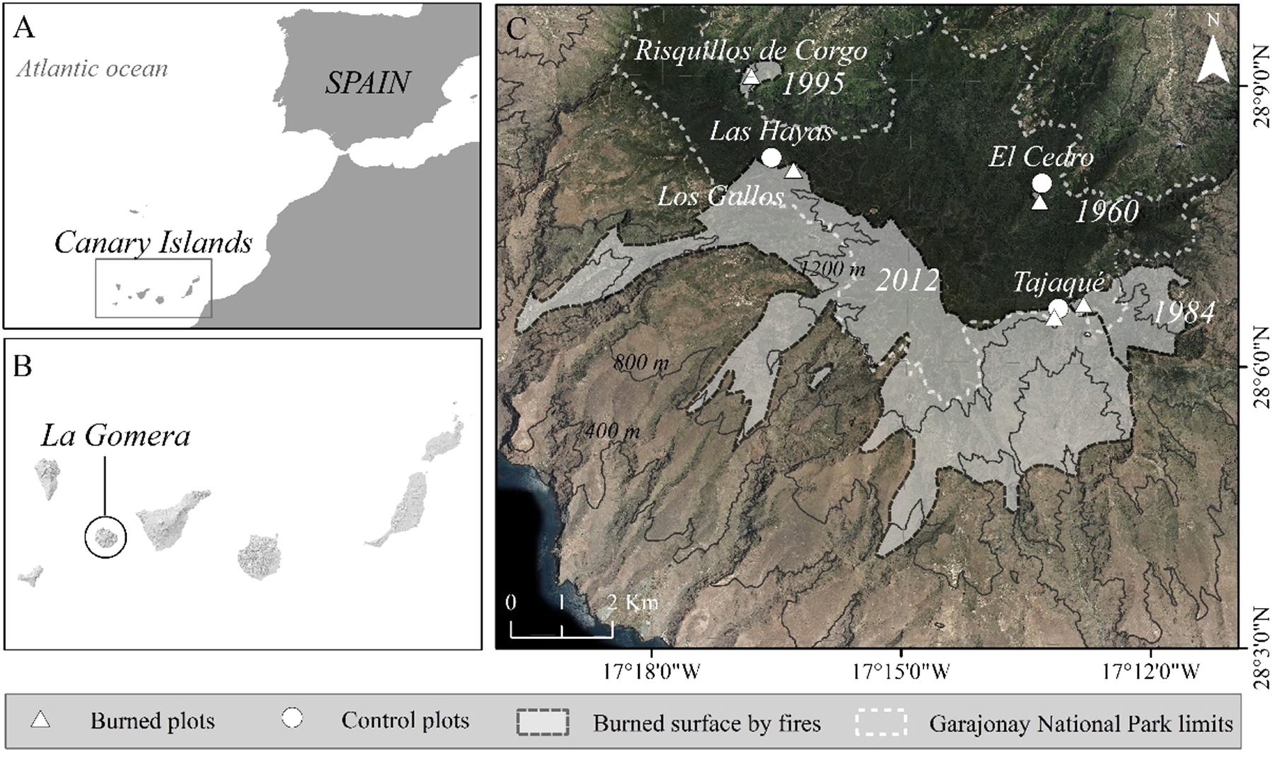In non-fire prone ecosystems, like some subtropical humid forests, fire produces habitat destruction and intensifies land degradation by inducing changes in native species composition, soil properties and erosive processes. Bryophytes are key components of the Macaronesian laurel forests playing an important role in regulating water cycling and microclimate. Ecological and taxonomical bryophytes groups have distinct ecological and physiological requirements and may respond in a different way to the same fire events. Therefore, analysing post fire recovery of bryophyte communities represents a key step towards a better understanding of forest fire drivers and post fire management. We investigated how species richness and composition of different ecological and taxonomical bryophyte groups varied in 1158 samples within a fire chronosequence from 5 to 57 years in the best-preserved laurel forest from Canary Islands (Garajonay National Park) analysing communities in terms of differences with comparable surrounding old growth unburnt stands. Epiphyte, terricolous and saxicolous bryophytes were sampled at each plot and the influence of the time since fire was analyzed together with environmental variables (temperature, precipitation, mist precipitation and elevation) and forest structure variables. Our results indicate that there is no general pattern of post fire recolonization, as recolonization varies depending on the ecological and phylogenetic groups considered. Climate and forest structure play an important role in post-fire recolonization, such that time since fire is not the most important variable influencing richness and composition. The results increase the understanding of the processes that shape compositional patterns in groups with high dispersal capacities and high microclimate dependence, such as mosses and liverworts.