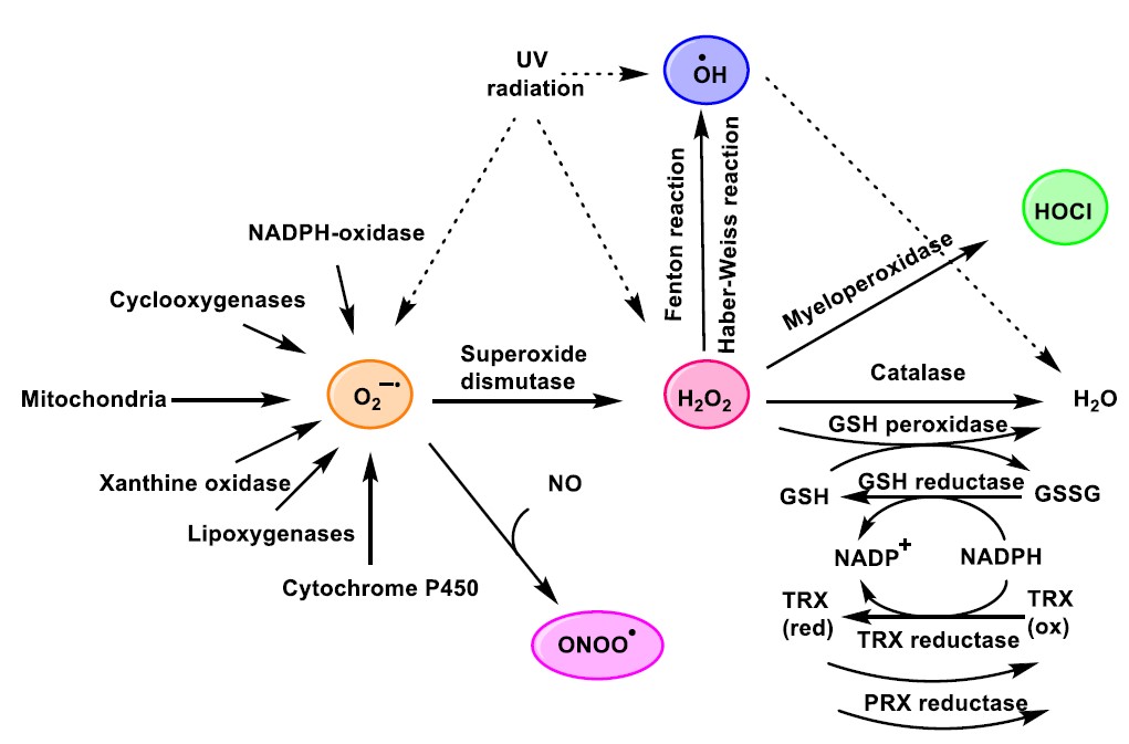 This review discusses the formation of hypochlorous acid HOCl and the role of reactive chlorinated species (RCS), which are catalysed by the enzyme myeloperoxidase MPO, mainly located in leukocytes and which in turn contribute to cellular oxidative stress. The reactions of RCS with various organic molecules such as amines, amino acids, proteins, lipids, carbohydrates, nucleic acids, and DNA are described, and an attempt is made to explain the chemical mechanisms of the formation of the various chlorinated derivatives and the data available so far on the effects of MPO, RCS and halogenative stress. Their presence in numerous pathologies such as atherosclerosis, arthritis, neurological and renal diseases, diabetes, and obesity is reviewed and were found to be a feature of debilitating diseases.