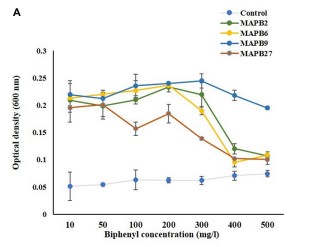 Polychlorinated biphenyls (PCBs) are persistent organic pollutants widely distributed in the environment and possess deleterious health effects. The main objective of the study was to obtain bacterial isolates from PCB-contaminated soil for enhanced biodegradation of PCB-77. Selective enrichment resulted in the isolation of 33 strains of PCB-contaminated soil nearby Bhilai steel plant, Chhattisgarh, India. Based on the prominent growth using biphenyl as the sole carbon source and the confirmation of its degradation by GC-MS/MS analysis, four isolates were selected for further study. The isolates identified by 16S rRNA gene sequencing were Pseudomonas aeruginosa MAPB-2, Pseudomonas plecoglossicida MAPB-6, Brucella anthropi MAPB-9, and Priestia megaterium MAPB-27. The isolate MAPB-9 showed a degradation of 66.15% biphenyl, while MAPB-2, MAPB-6, and MAPB-27 showed a degradation of 62.06, 57.02, and 56.55%, respectively in 48 h. Additionally, the degradation ability of these strains was enhanced with addition of co-metabolite glucose (0.2%) in the culture medium. Addition of glucose showed 100% degradation of biphenyl by MAPB-9, in 48 h, while MAPB-6, MAPB-2, and MAPB-27 showed 97.1, 67.5, and 53.3% degradation, respectively as analyzed by GC-MS/MS. Furthermore, in the presence of inducer, PCB-77 was found to be 59.89, 30.49, 27.19, and 4.43% degraded by MAPB-6, MAPB-9, MAPB-2, and MAPB-27, respectively in 7 d. The production of biosurfactants that aid in biodegradation process were observed in all the isolates. This was confirmed by ATR-FTIR analysis that showed the presence of major functional groups (CH2, CH3, CH, = CH2, C–O–C, C-O) of the biosurfactant. The biosurfactants were further identified by HPTLC and GC-MS/MS analysis. Present study is the first to report PCB-77 degradation potential of Pseudomonas aeruginosa, B. anthropi, Pseudomonas plecoglossicida, and Priestia megaterium. Similarly, this is the first report on Pseudomonas plecoglossicida and Priestia megaterium for PCB biodegradation. Our results suggest that the above isolates can be used for the biodegradation of biphenyl and PCB-77 in PCB-contaminated soil.