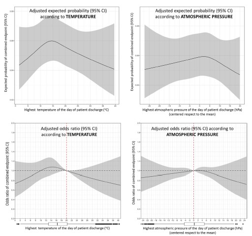 To investigate the relationship of ambient temperature and atmospheric pressure (AP) at patient discharge after an episode of acute heart failure (AHF) with very early post-discharge adverse outcomes. We analyzed 14,656 patients discharged after an AHF episode from 26 hospitals in 16 Spanish cities. The primary outcome was the 7-day post-discharge combined adverse event (emergency department –ED- revisit or hospitalization due to AHF, or all-cause death), and secondary outcomes were these three adverse events considered individually. Associations (adjusted for patient and demographic conditions, and length of stay -LOS- during the AHF index episode) of temperature and AP with the primary and secondary outcomes were investigated. We used restricted cubic splines to model the continuous non-linear association of temperature and AP with each endpoint. Some sensitivity analyses were performed. Patients were discharged after a median LOS of 5 days (IQR = 1–10). The highest temperature at discharge ranged from − 2 to 41.6 °C, and AP was from 892 to 1037 hPa. The 7-day post-discharge combined event occurred in 1242 patients (8.4%), with percentages of 7-day ED-revisit, hospitalization and death of 7.8%, 5.1% and 0.9%, respectively. We found no association between the maximal temperature and AP on the day of discharge and the primary or secondary outcomes. Similarly, there were no significant associations when the analyses were restricted to hospitalized patients (median LOS = 7 days, IQR = 4–11) during the index event, or when lag-1, lag-2 or the mean of the 3 post-discharge days (instead of point estimation) of ambient temperature and AP were considered. Temperature and AP on the day of patient discharge are not independently associated with the risk of very early adverse events during the vulnerable post-discharge period in patients discharged after an AHF episode.