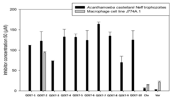 The genus Acanthamoeba is characterized by being a group of ubiquitous and free-living amoebae that inhabit a variety of environments. Generally, human infections by this parasite are associated with Acanthamoeba keratitis, especially in contact lens wearers, and with chronic but fatal granulomatous amoebic meningoencephalitis. Current treatments used for eradication of amoeba from infection sites represent a challenge for pharmacotherapy, due to the lack of effective treatment and the amoebae highly resistant to anti-amoebic drugs. In this study, we describe the results of the assessment of the IC50 of 10 isobenzofuran-1(3H)-one derivatives (QOET) against four Acanthamoeba strains. The compounds QOET-3 and QOET-9 were the selected derivatives with the lowest IC50 in A. castellanii Neff trophozoites (73.71 ± 0.25 and 69.99 ± 15.32 μM, respectively). Interestingly, analysis of the compound effects on the cell apoptosis-like features showed that both active molecules triggered programmed cell death (PCD) in A. castellanii Neff. The results obtained in this study highlights that isobenzofuranone derivatives could represent an interesting source for developing novel antiamoebic drugs.