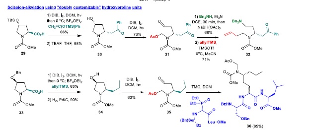 Hypervalent iodine reagents have been applied in many metal-free, efficient synthesis of natural products and other bioactive compounds. In particular, treatment of alcohols, acetals and acids with hypervalent iodine reagents and iodine results in O-radicals that can undergo a β-scission reaction. Under these oxidative conditions, derivatives of amino acids, peptides or carbohydrates are converted into cationic intermediates, which can subsequently undergo inter- or intramolecular addition of nucleophiles. Most reported papers describe the addition of oxygen nucleophiles, but this review is focused on the addition of carbon, nitrogen and phosphorous nucleophiles. The resulting products (nucleoside and alkaloid analogs, unnatural amino acids, site-selectively modified peptides) are valuable intermediates or analogs of bioactive compounds.