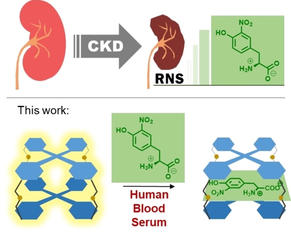 3-Nitrotyrosine (NT) is generated by the action of peroxynitrite and other reactive nitrogen species (RNS), and as a consequence it is accumulated in inflammation-associated conditions. This is particularly relevant in kidney disease, where NT concentration in blood is considerably high. Therefore, NT is a crucial biomarker of renal damage, although it has been underestimated in clinical diagnosis due to the lack of an appropriate sensing method. Herein we report the first fluorescent supramolecular sensor for such a relevant compound: Fluorescence by rotational restriction of tetraphenylethenes (TPE) in a covalent cage is selectively quenched in human blood serum by 3-nitrotyrosine (NT) that binds to the cage with high affinity, allowing a limit of detection within the reported physiological concentrations of NT in chronic kidney disease.