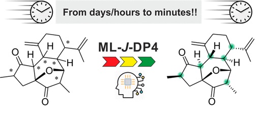 A new tool, ML-J-DP4, provides an efficient and accurate method for determining the most likely structure of complex molecules within minutes using standard computational resources. The workflow involves combining fast Karplus-type J calculations with NMR chemical shifts predictions at the cheapest HF/STO-3G level enhanced using machine learning (ML), all embedded in the J-DP4 formalism. Our ML provides accurate predictions, which compare favorably alongside with other ML methods.