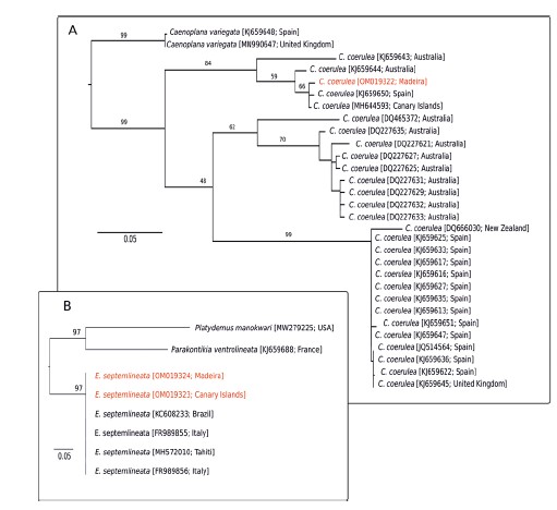 Oceanic islands harbour a limited richness of native land planarians, likely explained in large part by their inability to survive long periods of immersion in salt water (Winsor et al. 2004). Instead, most land planarians on islands are the result of introductions (e.g. Justine et al. 2018a; b; Lago-Barcia et al. 2020; Suárez et al. 2018; Winsor et al. 2004), likely due to the global trade of plants, as planarians can be inadvertently transported in the humid soil of pots (Álvarez-Presas et al. 2014; Winsor et al. 2004). Planarians are generalist predators (Sluys 1999) and a potential threat for native invertebrate fauna. Thus, the group has become of interest with regard to understanding the expansions of species distributions into non-native areas. We report here the presence of three invasive land planarian species within oceanic islands of the Macaronesian region: Obama nungara Carbayo, (Carbayo et al. 2016) (new for the Canary Islands), Caenoplana coerulea (Moseley 1877) (new for Madeira) and Endeavouria septemlineata (Hyman 1939) (new for the Canary Islands and Madeira).