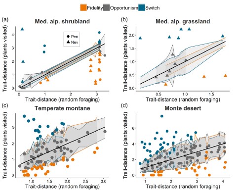 1. Switching plant species visited by pollinators (partner flexibility) has been proposed as a behavioural mechanism able to attenuate the negative impacts of shifts in plant communities on pollination. However, it is unclear whether the magnitude of such response is generalizable or depends on the environmental context. Moreover, the ability of pollinators to exploit plants with dissimilar traits (trait flexibility) has been overlooked, even though it can affect the spectrum of new partners available.