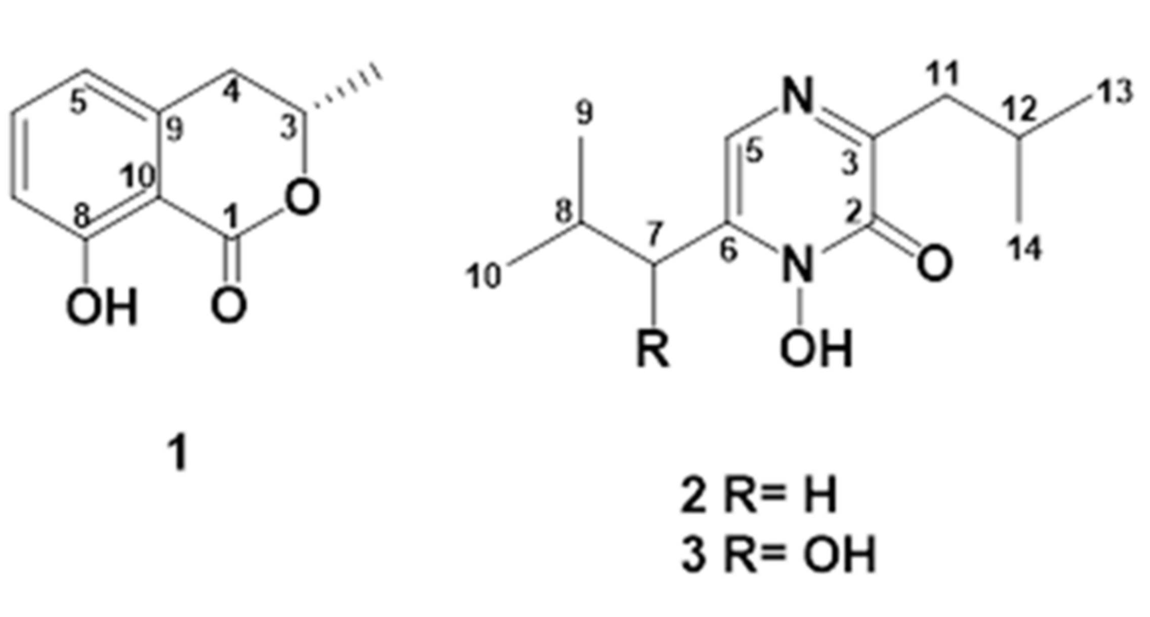 In the current study, an ethyl acetate extract from the endophytic fungus Aspergillus sp. SPH2 isolated from the stem parts of the endemic plant Bethencourtia palmensis was screened for its biocontrol properties against plant pathogens (Fusarium moniliforme, Alternaria alternata, and Botrytis cinerea), insect pests (Spodoptera littoralis, Myzus persicae, Rhopalosiphum padi), plant parasites (Meloidogyne javanica), and ticks (Hyalomma lusitanicum). SPH2 gave extracts with strong fungicidal and ixodicidal effects at different fermentation times. The bioguided isolation of these extracts gave compounds 1–3. Mellein (1) showed strong ixodicidal effects and was also fungicidal. This is the first report on the ixodicidal effects of 1. Neoaspergillic acid (2) showed potent antifungal effects. Compound 2 appeared during the exponential phase of the fungal growth while neohydroxyaspergillic acid (3) appeared during the stationary phase, suggesting that 2 is the biosynthetic precursor of 3. The mycotoxin ochratoxin A was not detected under the fermentation conditions used in this work. Therefore, SPH2 could be a potential biotechnological tool for the production of ixodicidal extracts rich in mellein.