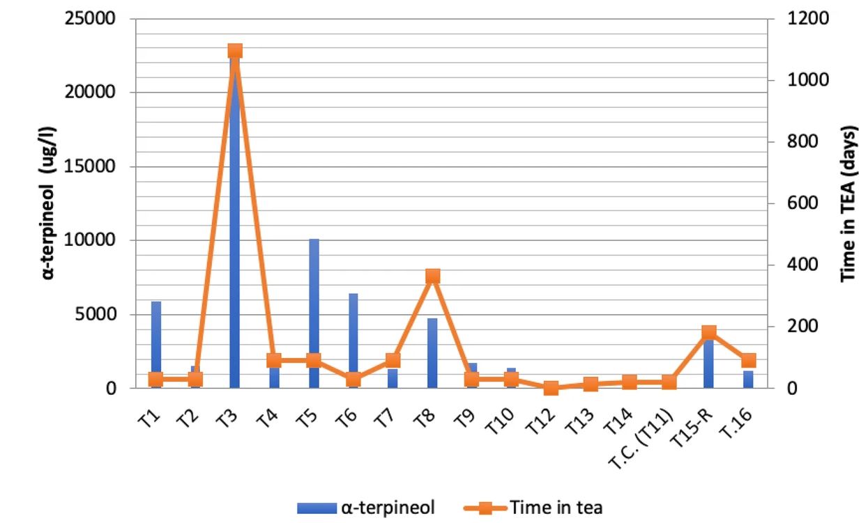 This paper presents the results of a novel study of Vino de Tea (pine heartwood wine) from the island of La Palma (Canary Islands, Spain). The aim is to investigate its differential characteristics and contribute to typifying it within the Denomination of Origin ‘Wines of La Palma’. The analysis is based on a mixed approach combining a qualitative ethnographic approach (22 interviews) and quantitative physic-chemical methods in a sample of 16 wines. The ethnographical study revealed the tradition and techniques of elaboration behind Vino de Tea. In turn, the physic-chemical analysis revealed by chromatography a significant presence of α-terpineol due to elaboration in pine barrels or casks. These samples were compared with a Greek Retsina wine, revealing the differences between these two traditional wines. These data suggest that Vino de Tea is a unique product with distinctive characteristics and potential health benefits, owing to its significant content of α-terpineol resulting from its fermentation in Canary pine casks.