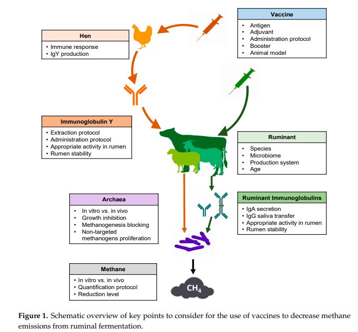 Ruminants produce considerable amounts of methane during their digestive process, which makes the livestock industry as one of the largest sources of anthropogenic greenhouse gases. To tackle this situation, several solutions have been proposed, including vaccination of ruminants against microorganisms responsible for methane synthesis in the rumen. In this review, we summarize the research done on this topic and describe the state of the art of this strategy. The different steps implied in this approach are described: experimental design, animal model (species, age), antigen (whole cells, cell parts, recombinant proteins, peptides), adjuvant (Freund’s, Montanide, saponin, among others), vaccination schedule (booster intervals and numbers) and measurements of treatment success (immunoglobulin titers and/or effects on methanogens and methane production). Highlighting both the advances made and knowledge gaps in the use of vaccines to inhibit ruminant methanogen activity, this research review opens the door to future studies. This will enable improvements in the methodology and systemic approaches so as to ensure the success of this proposal for the sustainable mitigation of methane emission.
