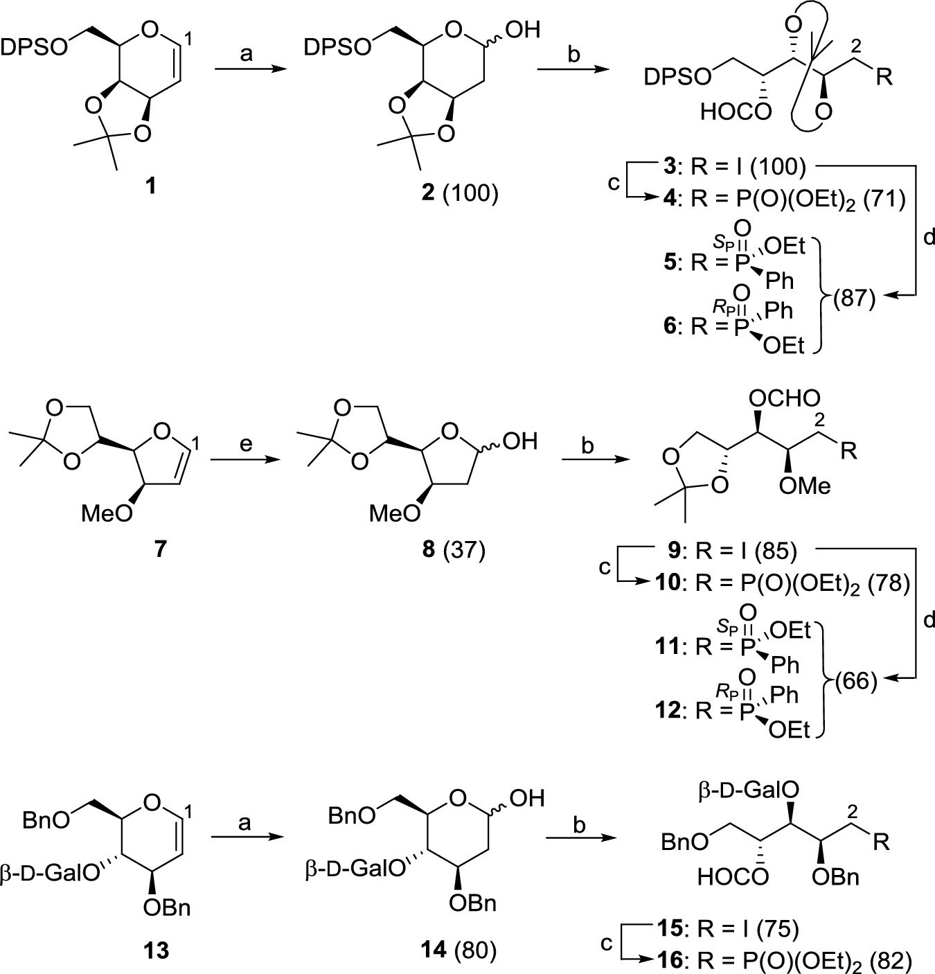 The anomeric alkoxyl radical β-fragmentation (ARF) of carbohydrates possessing an electron-withdrawing group (EWG) at C2, promoted by PhI(OAc)2/I2, gives rise to an acyclic iodide through which a pentavalent atom of phosphorus can be introduced via the Arbuzov reaction. After selective hydrolysis and subsequent cyclization, the phosphonate or phosphinate intermediates can be converted into 2-deoxy-1-phosphahexopyranose and 2-deoxy-1-phosphapentopyranose sugars. The ARF of carbohydrates with an electron-donor group (EDG) at C2 proceeds by a radical-polar crossover mechanism, and the cyclization occurs by nucleophilic attack of a conveniently positioned phosphonate or phosphinate group to the transient oxocarbenium ion. This alternative methodology leads to 5-phosphasugars with a 4-deoxy-5-phosphapentopyranose framework. The structure and conformation of the 2-oxo-1,2-oxaphosphinane and 2-oxo-1,2-oxaphospholane ring systems in different carbohydrate models have been studied by NMR and X-ray crystallography.