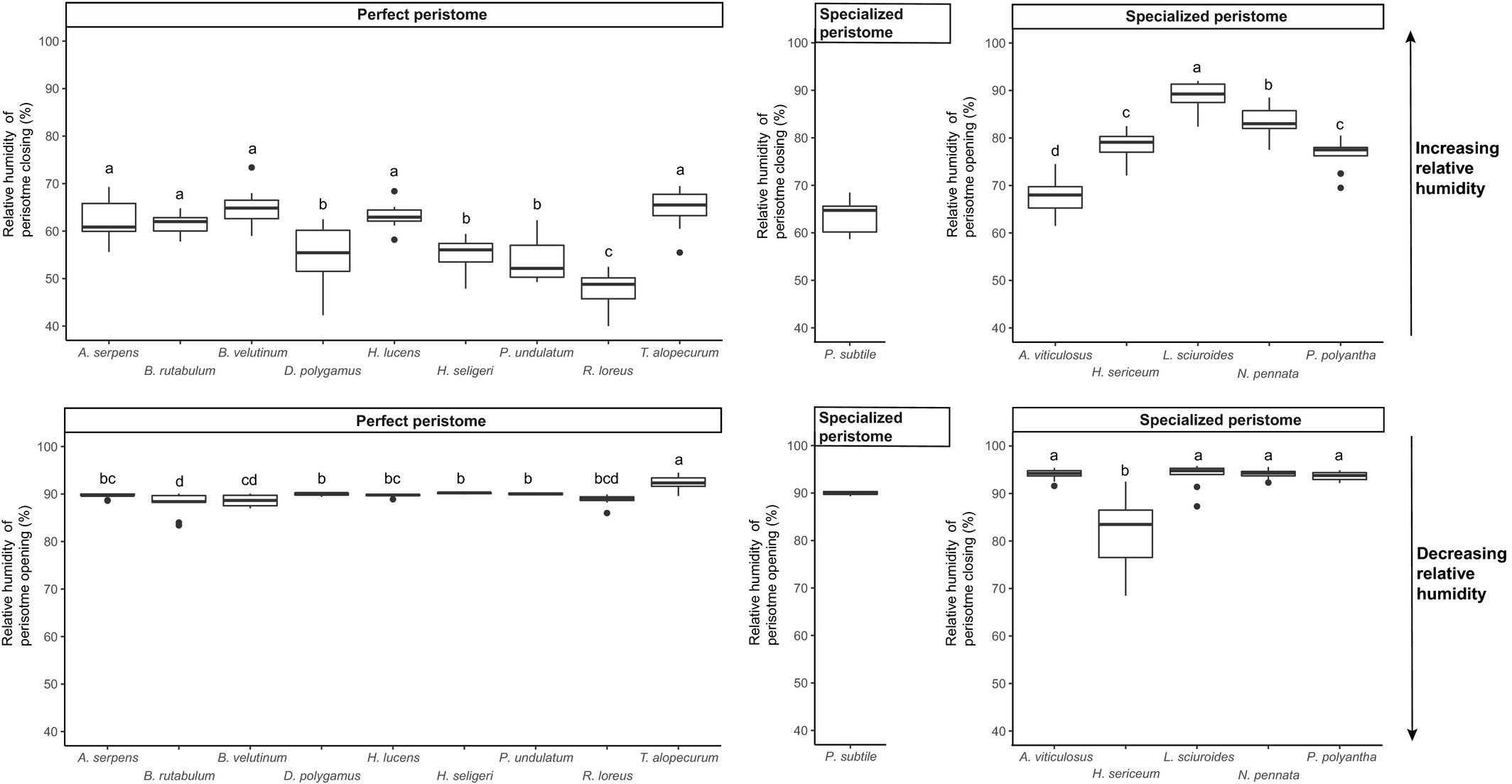 Under which humidity conditions are moss spores released? A comparison between species with perfect and specialized peristomes