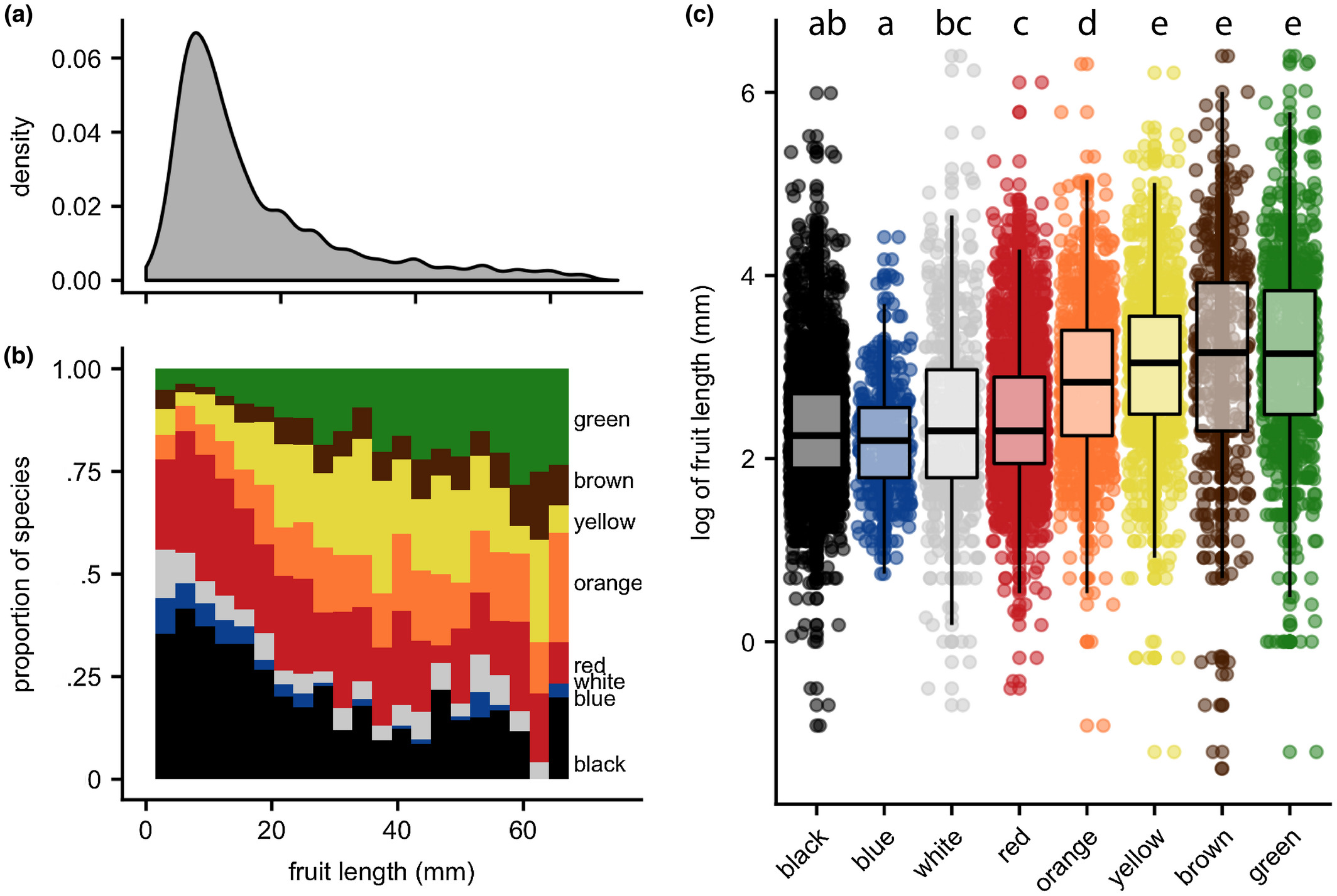 [Aim] Fruit colours attract animal seed dispersers, yet the causes of fruit colour diversity remain controversial. The lack of knowledge of large-scale spatial patterns in fruit colours has limited our ability to formulate and test alternative hypotheses to explain fruit colour, fruit size and fruit colour diversity. We describe spatial (especially latitudinal) variation in fruit colour, colour diversity and length, and test for correlations between fruit colour, length and plant habit. [Location] Global. [Time period] Present day. [Major taxa studied] Seed plants. [Methods] We assembled a database of fruit traits for 13,178 fleshy fruited plant species spanning 136 sites around the world. To assess whether fruit colour categories correspond with spectral reflectances, we tested for clustering of hue, chroma and saturation for 236 species for which we had reflectance data. We then quantified latitudinal gradients in fruit colour, fruit length and fruit colour diversity while controlling for the effects of plant habit and whether colour categories varied with respect to average fruit size. [Results] Colour categories corresponded well with reflectance data. The tropics show high colour diversity, while red fruits progressively constitute a higher proportion of the fleshy-fruited plant community towards high latitudes. All mammal-associated colours (green, orange, brown and yellow) are more common in the tropics than at high latitudes. Fruit length also increases towards the tropics. [Main conclusions] Tropical communities tend to have diverse fruit colours, including many mammal-associated fruit colours, while high latitude communities contain a higher percentage of red-fruited species. The correlation between colour and size is strong, and some latitudinal patterns may be partly driven by changes in fruit size. Differences in geography and in the history of plant lineages in the Southern versus the Northern Hemisphere may help to explain some biogeographic patterns, but alternative hypotheses related to fruit defence, development and metabolic costs are plausible.
