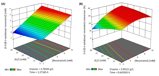 Resveratrol is a natural polyphenol with antioxidant activity and numerous health benefits. However, in vivo application of this compound is still a challenge due to its poor aqueous solubility and rapid metabolism, which leads to an extremely low bioavailability in the target tissues. In this work, rXynSOS-E236G glycosynthase, designed from a GH10 endoxylanase of the fungus Talaromyces amestolkiae, was used to glycosylate resveratrol by using xylobiosyl-fluoride as a sugar donor. The major product from this reaction was identified by NMR as 3-O-ꞵ-d-xylobiosyl resveratrol, together with other glycosides produced in a lower amount as 4′-O-ꞵ-d-xylobiosyl resveratrol and 3-O-ꞵ-d-xylotetraosyl resveratrol. The application of response surface methodology made it possible to optimize the reaction, producing 35% of 3-O-ꞵ-d-xylobiosyl resveratrol. Since other minor glycosides are obtained in addition to this compound, the transformation of the phenolic substrate amounted to 70%. Xylobiosylation decreased the antioxidant capacity of resveratrol by 2.21-fold, but, in return, produced a staggering 4,866-fold improvement in solubility, facilitating the delivery of large amounts of the molecule and its transit to the colon. A preliminary study has also shown that the colonic microbiota is capable of releasing resveratrol from 3-O-ꞵ-d-xylobiosyl resveratrol. These results support the potential of mutagenic variants of glycosyl hydrolases to synthesize highly soluble resveratrol glycosides, which could, in turn, improve the bioavailability and bioactive properties of this polyphenol.