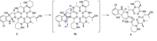 The structure of petrichorin C1 (4) converted from petrichorin C (3) was determined using NMR spectroscopy and X-ray crystallography. The chemical stability of petrichorins A and C (1 and 3) was investigated by NMR spectroscopy, X-ray crystallography, and calculations.