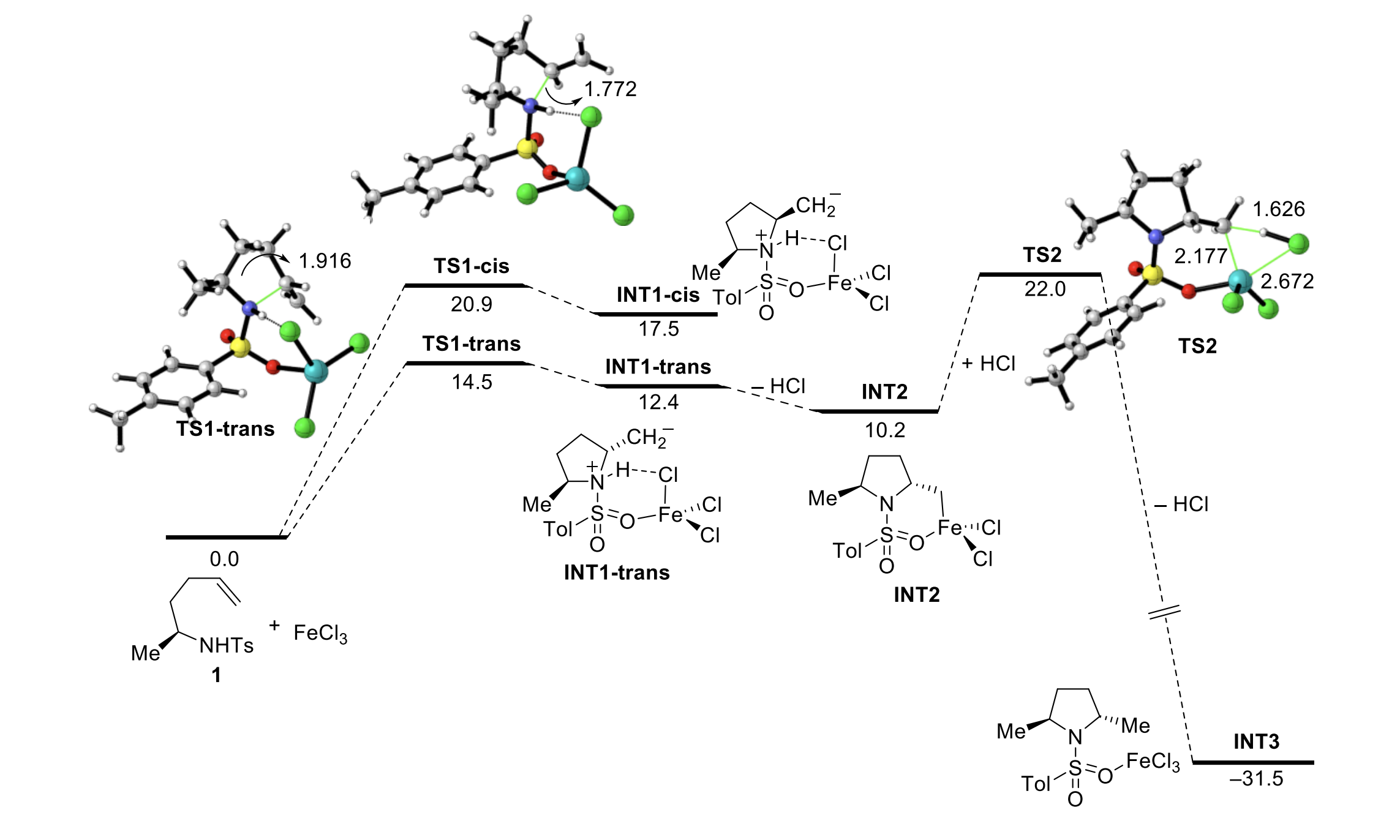 A highly efficient, diastereoselective, iron(III)‐catalyzed intramolecular hydroamination/cyclization reaction involving α‐substituted amino alkenes is described. Thus, enantiopure trans‐2,5‐disubstituted pyrrolidines and trans‐5‐substituted proline derivatives were synthesized by means of a combination of enantiopure starting materials, easily available from l‐α‐amino acids, with sustainable metal catalysts such as iron(III) salts. The scope of this methodology is highlighted in an enantiodivergent approach to the synthesis of both (+)‐ and (−)‐pyrrolidine 197B alkaloids from l‐glutamic acid. In addition, a computational study was carried out to gain insight into the complete diastereoselectivity of the transformation.