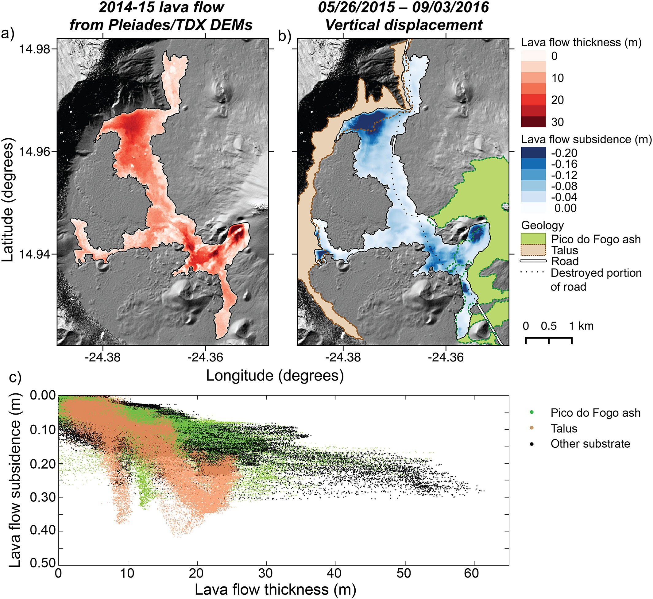 Resolving changes in topography through time using accurate high‐resolution digital elevation models (DEMs) is key to understanding active volcanic processes. For the first time in a volcanic environment, we utilize very high‐resolution tri‐stereo optical imagery acquired by the Pleiades‐1 satellite constellation and generate a 1 m resolution DEM of Fogo Volcano, Cape Verde—the most active volcano in the Eastern Atlantic region. Point cloud density is increased by a factor of 6.5 compared to conventional stereo imagery, and the number of 1 m2 pixels with no height measurements is reduced by 43%. We use the DEM to quantify topographic changes associated with the 2014–2015 eruption at Fogo. Height differences between the posteruptive Pleiades‐1 DEM and the preeruptive topography from TanDEM‐X give a lava flow volume of 45.83 ± 0.02 × 106 m3, emplaced over an area of 4.8 km2 at a mean rate of 6.8 m3 s−1.