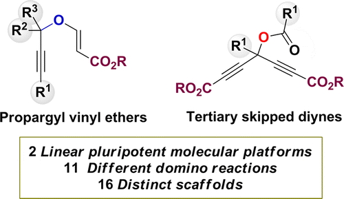 During the last years, we have been involved in the development of a diversity-oriented synthetic strategy aimed at transforming simple, linear, and densely functionalized molecular platforms into collections of topologically diverse scaffolds incorporating biologically relevant structural motifs such as N- and O- heterocycles, multifunctionalized aromatic rings, fused macrocycles, etc. The strategy merges the concepts of pluripotency (the property of an array of chemical functionalities to express different chemical outcomes under different chemical environments) and domino chemistry (chemistry based on processes involving two or more bond-forming transformations that take place while the initial reaction conditions are maintained, with the subsequent reaction resulting as a consequence of the functionality installed in the previous one) to transform common multifunctional substrates into complex and diverse molecular frameworks. This design concept constitutes the ethos of the so-called branching cascade strategy, a branch of diversity-oriented synthesis focused on scaffold diversity generation. Two pluripotent molecular platforms have been extensively studied under this merging (branching) paradigm: C4–O–C3 propargyl vinyl ethers (PVEs) and C7 tertiary skipped diynes (TSDs). These are conveniently constructed from simple and commercially available raw materials (alkyl propiolates, ketones, aldehydes, acid chlorides) through multicomponent manifolds (ABB′ three-component reaction for PVEs; A2BB′ four-component reaction for TSDs) or a simple two-step procedure (for PVEs). Their modular origin facilitates their structural/functional diversification without increasing the number of synthetic steps for their assembly. These two pluripotent molecular platforms accommodate a well-defined and dense array of through-bond/through-space interrelated functionalities on their structures, which defines their primary reactivity principles and establishes the reactivity profile. The PVEs are defined by the presence of an alkyne (alkynoate) function and a conjugated enol moiety and their mutual through-bond/through-space connectivity. This functional array accommodates a number of domino reactions launched either by a Michael addition on the alkynoate moiety (conjugated alkynes) or by a [3,3]-propargyl Claisen rearrangement (conjugated and nonconjugated alkynes). The reactivity profile of the TSDs is defined by the two connected alkynoate moieties (Michael addition) and the bispropargylic ester group ([3,3]-sigmatropic rearrangement). Using these first reactivity principles, each platform selectively delivers one unique and different skeleton (topology) from each domino transformation. Thus, through the use of 11 instrumentally simple and scalable domino reactions, we have transformed these two linear (rod-symmetric) pluripotent molecular platforms into 16 different scaffolds incorporating important structural motifs and multifunctional decorative patterns. The generated scaffolds entail carbocycles, heterocycles, aromatics, β,γ-unsaturated esters and acids, and fused polycycles. They can be transformed into more elaborated molecular skeletons by the use of chemical handles generated in their own domino reactions or by appending different functionalities to the pluripotent molecular platform (secondary reactivity principles).