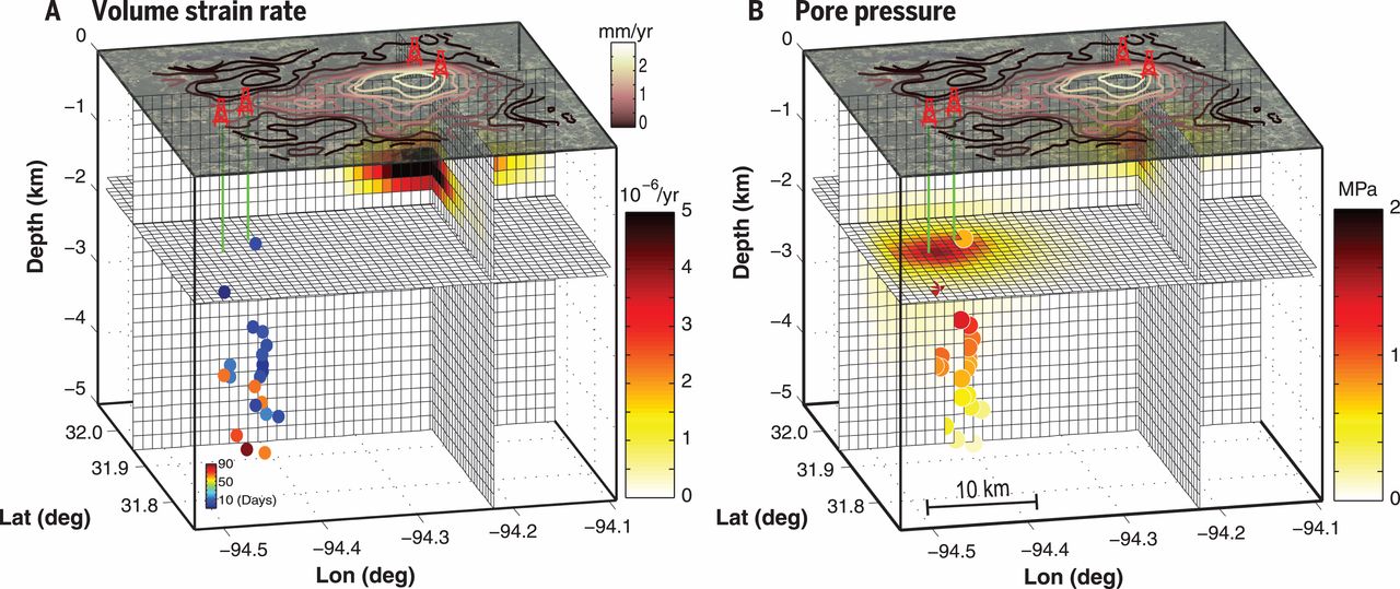 Observations that unequivocally link seismicity and wastewater injection are scarce. Here we show that wastewater injection in eastern Texas causes uplift, detectable in radar interferometric data up to >8 kilometers from the wells. Using measurements of uplift, reported injection data, and a poroelastic model, we computed the crustal strain and pore pressure. We infer that an increase of >1 megapascal in pore pressure in rocks with low compressibility triggers earthquakes, including the 4.8–moment magnitude event that occurred on 17 May 2012, the largest earthquake recorded in eastern Texas. Seismic activity increased even while injection rates declined, owing to diffusion of pore pressure from earlier periods with higher injection rates. Induced seismicity potential is suppressed where tight confining formations prevent pore pressure from propagating into crystalline basement rocks.