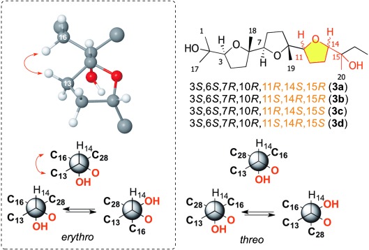 he structural determination of small organic molecules is mainly undertaken by using NMR techniques, although it is increasingly supplemented by using computational methods. NMR parameters, such as chemical shifts and coupling constants, are extremely sensitive indicators of local molecular conformation and are a source of structural evidence. However, their interpretation is fairly challenging in many circumstances, such as the case of the new polyether squalene derivative nivariol, the structure of which was elucidated by means of NMR spectroscopy and DFT calculations. The potential flexibility of this molecule and the high number of quaternary carbon atoms that it contains make its configurational assignment very difficult. Moreover, the relative configuration of four separated stereoclusters was established and subsequently connected by using NOE and J‐based analysis, as well as by a comparison of its experimental 13C NMR chemical shifts with the corresponding population‐weighted values, as calculated by using DFT methods. Limitations of these used approaches became apparent but were overcome by combining the two methods.