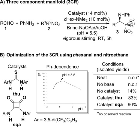 A study was conducted to demonstrate that H-bond based asymmetric organocatalysis can be performed under the so-called in the presence of water conditions. Nitroalkane, catalyst, dimethylcyclohexylamine, benzaldehyde and aniline were mixed to a 0°C cooled and vigorously stirred aqueous solution of NaOAc/AcOH saturated with NaCl. The organic residues were taken into dichloromethane and decanted off. The combined organic fractions were dried over Na2SO4, filtered and the filtrate was concentrated. The residue was purified by flash column chromatography (silica gel) using a mixture of hexanes/ethyl acetate. From a synthetic point of view, the reaction furnishes enantioenriched b-nitroamines decorated with aromatic or aliphatic substituents at the amine center and a different set of alkyl chains or rings attached to the carbon bearing the nitro functionality. Importantly, the reaction can be scaled up without losing yield and stereoselectivity and with full recovery of the catalyst.