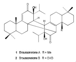 Broussonetone A (1) and broussonetone B (2), two novel dimeric abietane diterpenes, have been isolated from Salvia broussonetii root cultures transformed by Agrobacterium rhizogenes. The structure of broussonetone A was determined from spectroscopic data and confirmed by X-ray analysis. This dimer can be formed by a [4+2]-cycloaddition of two molecules of 13β-hydroxyabieta-8(14),9(11)-dien-12-one. NMR data of broussonetone B indicated that the C-20 methyl in part B of the broussonetone A molecule had been substituted by an aldehyde group. Thus, broussonetone B could be formed by an analogous Diels Alder reaction between 13β-hydroxyabieta-8(14),9(11)-dien-12-one as the dienophile and its 20-oxo derivative as the electrophile.