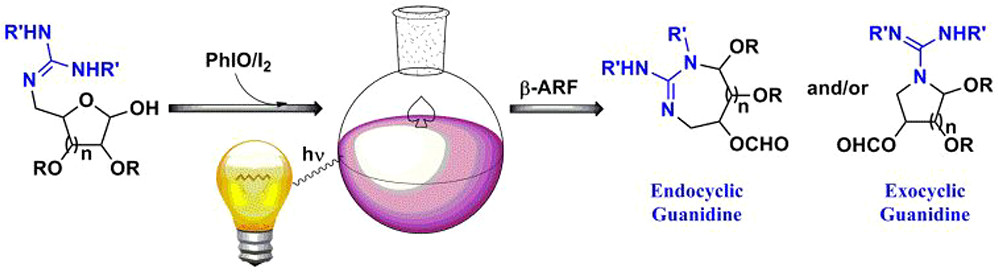 The fragmentation of anomeric alkoxyl radicals (ARF) and the subsequent cyclization promoted by hypervalent iodine provide an excellent method for the synthesis of guanidino-sugars. The methodology described herein is one of the few existing general methodologies for the formation of medium-sized exo- and endoguanidine-containing heterocycles presenting a high degree of oxygenation in their structure.