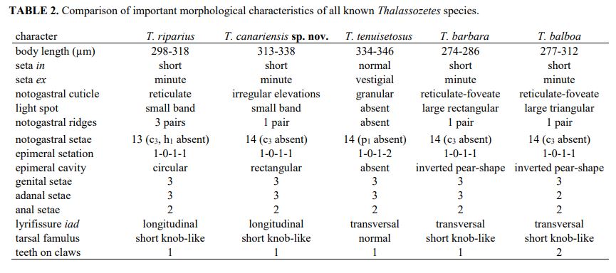 A new species of intertidal oribatid mites from Tenerife is described and its full ontogenetic development is given in detail. Thalassozetes canariensis sp. nov. can easily be distinguished from its congeners by its characteristic notogastral cuticular pattern showing loosely distributed irregular elevations, and its rectangular median sternal cavity. Based on morphology, Thalassozetes canariensis sp. nov. is most closely related to the Mediterranean T. riparius; both species share a small transversal band-like notogastral light spot and the longitudinal orientation of lyrifissure iad. The juvenile morphology of T. canariensis sp. nov. conforms basically to those of known Thalassozetes juveniles but there are discrepancies in certain aspects that require further research into all known species. This report of T. canariensis sp. nov. from Tenerife is the first record of an intertidal mite for the Canaries, and also for the Eastern Atlantic area. Further records of this species within the area may be expected.