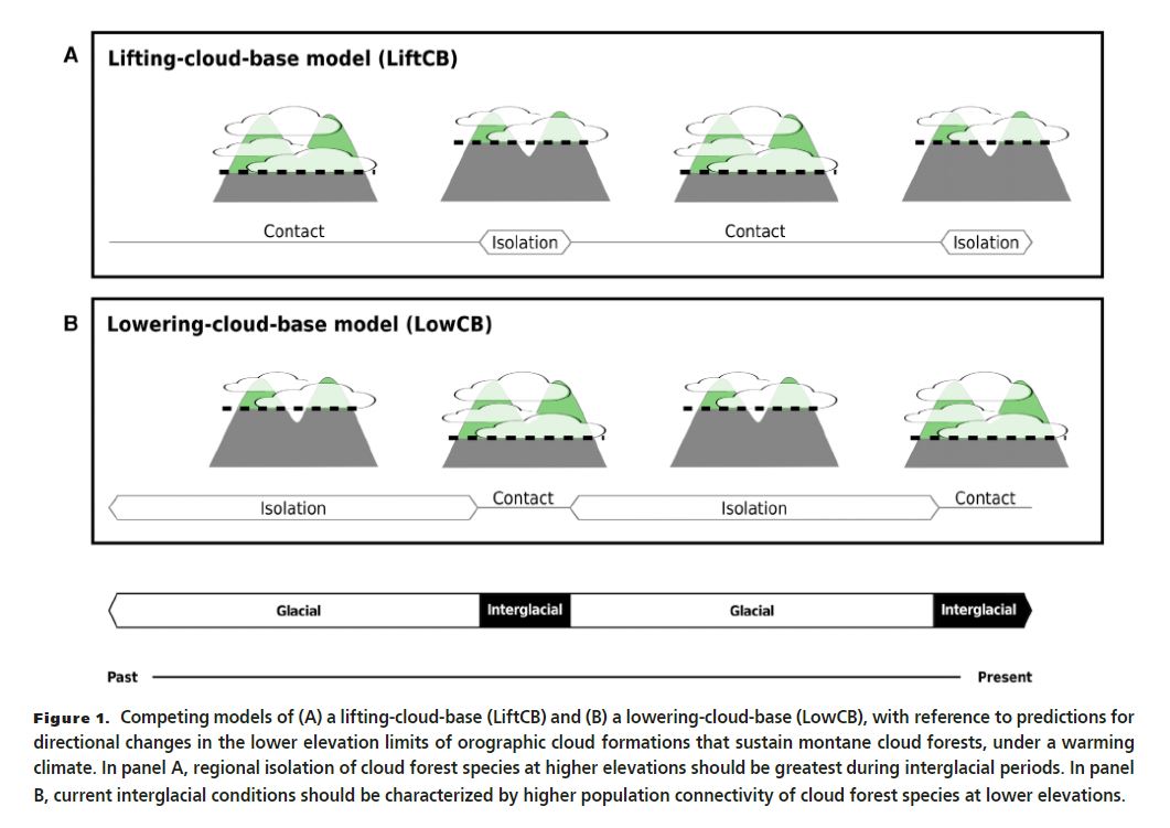 Montane cloud forests are areas of high endemism, and are one of the more vulnerable terrestrial ecosystems to climate change. Thus, understanding how they both contribute to the generation of biodiversity, and will respond to ongoing climate change, are important and related challenges. The widely accepted model for montane cloud forest dynamics involves upslope forcing of their range limits with global climate warming. However, limited climate data provides some support for an alternative model, where range limits are forced downslope with climate warming. Testing between these two models is challenging, due to the inherent limitations of climate and pollen records. We overcome this with an alternative source of historical information, testing between competing model predictions using genomic data and demographic analyses for a species of beetle tightly associated to an oceanic island cloud forest. Results unequivocally support the alternative model: populations that were isolated at higher elevation peaks during the Last Glacial Maximum are now in contact and hybridizing at lower elevations. Our results suggest that genomic data are a rich source of information to further understand how montane cloud forest biodiversity originates, and how it is likely to be impacted by ongoing climate change.