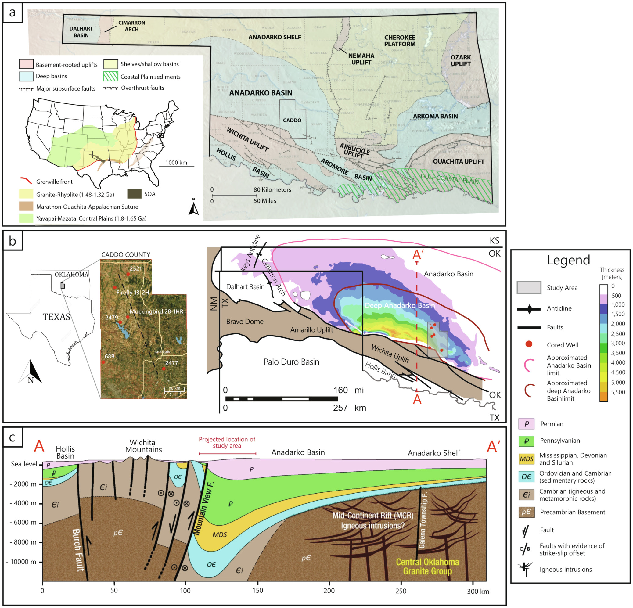 The Anadarko Basin of Oklahoma represents a major Paleozoic depocenter that existed along the rifted margins of southwestern Laurentia. In its infancy it accumulated a thick series of Cambrian through Mississippian detritus while further subsidence caused by inversion of the Cambrian Southern Oklahoma Aulacogen resulted in voluminous Pennsylvanian to Permian sediment. This contribution reports new data on K-Ar ages and trace-element geochemistry of detrital illite from middle and upper Pennsylvanian shale used to reconstruct sediment origins at the peak period of subsidence of the Anadarko Basin. X-ray diffraction was used to unveil mineral compositions and abundances of illite polytypes in two size fractions of separated illite (˂1 and 2-1 μm). K-Ar isotopic analyses were completed for both fine fractions, while the laser ablation inductively coupled plasma mass spectrometry was done for the latter. All illite separates consisted of mixtures of authigenic (1Md) and detrital (2M1) illite. The Illite Age Analyses showed that the detrital age of Desmoinesian (Moscovian) shale is the late Ediacaran (584 Ma), while the age of Missourian (Kasimovian) shale is the middle Cambrian (512.5 Ma). Trace-element abundances of all analyzed illite, irrespectively of stratigraphic age, are consistent with those of mica from metamorphic rocks. Based on illite detrital age and geochemistry it was inferred that Desmoinesian (Moscovian) shale represents a mixture of Neoproterozoic and Cambrian detritus sourced locally, whereas Missourian (Kasimovian) shale records a provenance shift toward more distal easterly sources from the Ouachita-(Marathon) foreland. This study has proposed a sediment source transition between the middle and upper Pennsylvanian that likely reflected major changes in the basin paleogeography and progressive development of the east-west (transcontinental) fluvial systems.