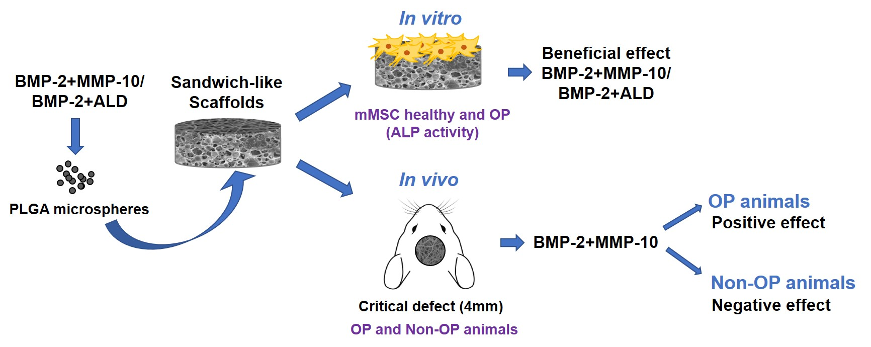 Biomaterials-mediated bone formation in osteoporosis (OP) is challenging as it requires tissue growth promotion and adequate mineralization. Based on our previous findings, the development of scaffolds combining bone morphogenetic protein 2 (BMP-2) and matrix metalloproteinase 10 (MMP-10) shows promise for OP management. To test our hypothesis, scaffolds containing BMP-2 + MMP-10 at variable ratios or BMP-2 + Alendronate (ALD) were prepared. Systems were characterized and tested in vitro on healthy and OP mesenchymal stem cells and in vivo bone formation was studied on healthy and OP animals. Therapeutic molecules were efficiently encapsulated into PLGA microspheres and embedded into chitosan foams. The use of PLGA (poly(lactic-co-glycolic acid)) microspheres as therapeutic molecule reservoirs allowed them to achieve an in vitro and in vivo controlled release. A beneficial effect on the alkaline phosphatase activity of non-OP cells was observed for both combinations when compared with BMP-2 alone. This effect was not detected on OP cells where all treatments promoted a similar increase in ALP activity compared with control. The in vivo results indicated a positive effect of the BMP-2 + MMP-10 combination at both of the doses tested on tissue repair for OP mice while it had the opposite effect on non-OP animals. This fact can be explained by the scaffold’s slow-release rate and degradation that could be beneficial for delayed bone regeneration conditions but had the reverse effect on healthy animals. Therefore, the development of adequate scaffolds for bone regeneration requires consideration of the tissue catabolic/anabolic balance to obtain biomaterials with degradation/release behaviors suited for the existing tissue status.