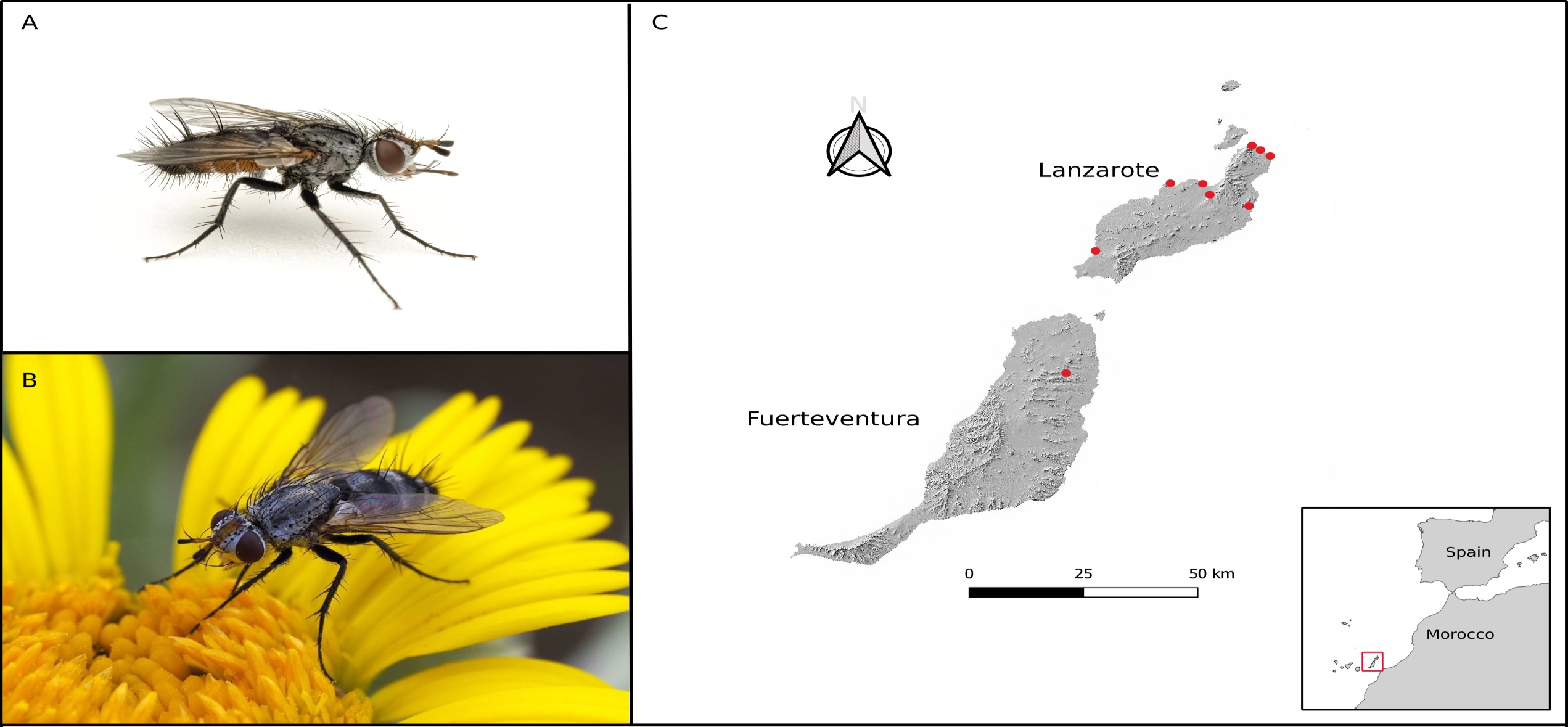 The Canary Islands are an archipelago of volcanic origin, located off north-west Africa comprising eight islands. Fuerteventura and Lanzarote are the oldest (20 and 15 millon years old, respectively) and the easternmost islands. The order Diptera is one of the most relevant taxa in the Canary Islands as they constitute the second highest species richness. Within this order, the family Tachinidae is especially interesting as all species are endoparasitoids of arthropods and most species play a key role as pollinators. In the Canary Islands, the family comprises 52 species, with Fuerteventura and Lanzarote harbouring up to 20 species each.