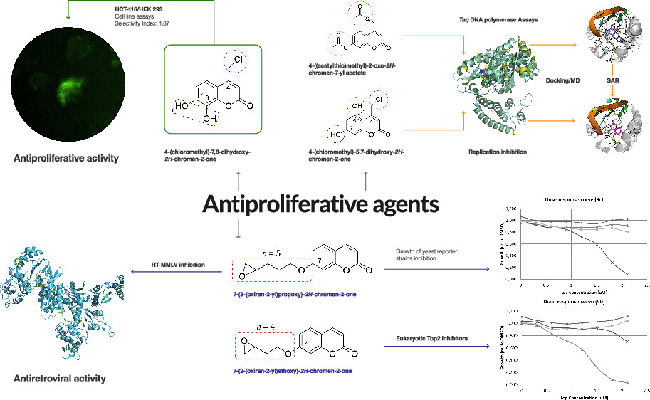 A library of structurally related coumarins was generated through synthesis reactions and chemical modification reactions to obtain derivatives with antiproliferative activity both in vivo and in vitro. Out of a total of 35 structurally related coumarin derivatives, seven of them showed inhibitory activity in in vitro tests against Taq DNA polymerase with IC50 values lower than 250 μM. The derivatives 4-(chloromethyl)-5,7-dihydroxy-2H-chromen-2-one (2d) and 4-((acetylthio)methyl)-2-oxo-2H-chromen-7-yl acetate (3c) showed the most promising anti-polymerase activity with IC50 values of 20.7 ± 2.10 and 48.25 ± 1.20 μM, respectively. Assays with tumor cell lines (HEK 293 and HCT-116) were carried out, and the derivative 4-(chloromethyl)-7,8-dihydroxy-2H-chromen-2-one (2c) was the most promising, with an IC50 value of 8.47 μM and a selectivity index of 1.87. In addition, the derivatives were evaluated against Saccharomyces cerevisiae strains that report about common modes of actions, including DNA damage, that are expected for agents that cause replicative stress. The coumarin derivatives 7-(2-(oxiran-2-yl)ethoxy)-2H-chromen-2-one (5b) and 7-(3-(oxiran-2-yl)propoxy)-2H-chromen-2-one (5c) caused DNA damage in S. cerevisiae. The O-alkenylepoxy group stands out as that with the most important functionality within this family of 35 derivatives, presenting a very good profile as an antiproliferative scaffold. Finally, the in vitro antiretroviral capacity was tested through RT-PCR assays. Derivative 5c showed inhibitory activity below 150 μM with an IC50 value of 134.22 ± 2.37 μM, highlighting the O-butylepoxy group as the functionalization responsible for the activity.