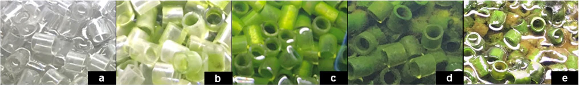 Packed-bed biofilm photobioreactor combined with ultrafiltration membrane was investigated for intensifying the process for secondary wastewater effluent treatment. Cylindrical glass carriers were used as supporting material for the microalgal-bacterial biofilm, which developed from indigenous microbial consortium. Glass carriers allowed adequate growth of the biofilm with limited suspended biomass. Stable operation was achieved after a start-up period of 1000 h, where supernatant biopolymer clusters were minimized and complete nitrification was observed. After that time, biomass productivity was 54 ± 18 mg·L−1·day−1. Green microalgae Tetradesmus obliquus and several strains of heterotrophic nitrification–aerobic denitrification bacteria and fungi were identified. Combined process exhibited COD, nitrogen and phosphorus removal rates of 56 ± 5%, 12 ± 2% and 20 ± 6%, respectively. Membrane fouling was mainly caused by biofilm formation, which was not effectively mitigated by air-scouring aided backwashing.