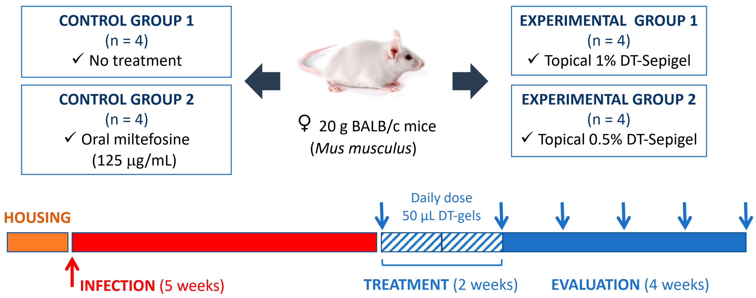 One of the most important steps in preclinical drug discovery is to demonstrate the in vivo efficacy of potential leishmanicidal compounds and good characteristics at the level of parasite killing prior to initiating human clinical trials. This paper describes the use of dehydrothyrsiferol (DT), isolated from the red alga Laurencia viridis, in a pharmaceutical form supported on Sepigel, and the in vivo efficacy against a mouse model of cutaneous leishmaniasis. Studying the ultrastructural effect of DT was also carried out to verify the suspected damage at the cellular level and determine the severity of damages produced in the homeostasis of promastigotes. BALB/c mice infected with Leishmania amazonensis were divided into four groups: untreated mice, mice treated with miltefosine orally and mice treated topically with 1% and 0.5% DT-Sepigel; treatment was carried out for two weeks. Treatment with DT significantly reduced the parasite load in skin, liver and spleen compared with the untreated group. In addition, DT-Sepigel at the lowest concentration (0.5%) showed the best results, reducing lesion size by 87% at 3 weeks post-treatment. DT-Sepigel has demonstrated to be a potent topical treatment that, in combined drug trials, may aim at combating cutaneous leishmaniasis.