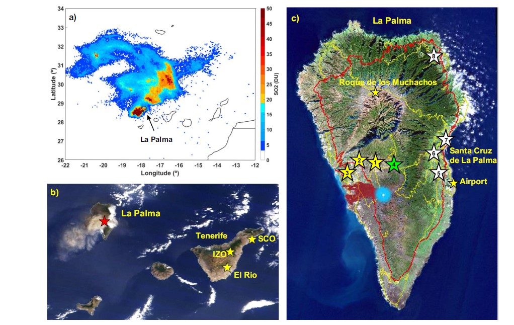 The La Palma 2021 volcanic eruption was the first subaerial eruption in a 50-year period in the Canary Islands (Spain), emitting ~1.8 Tg of sulphur dioxide (SO2) into the troposphere over nearly 3 months (19 September-13 December 2021), exceeding the total anthropogenic SO2 emitted from the 27 European Union countries in 2019. We conducted a comprehensive evaluation of the impact of the 2021 volcanic eruption on air quality (SO2, PM10 and PM2.5 concentrations) utilising a multidisciplinary approach, combining ground and satellite-based measurements with height-resolved aerosol and meteorological information. High concentrations of SO2, PM10 and PM2.5 were observed in La Palma (hourly mean SO2 up to ~2600 μg m−3 and also sporadically at ~140 km distance on the island of Tenerife (> 7700 μg m−3) in the free troposphere. PM10 and PM2.5 daily mean concentrations in La Palma peaked at ~380 and 60 μg m−3. Volcanic aerosols and desert dust both impacted the lower troposphere in a similar height range (~ 0–6 km) during the eruption, providing a unique opportunity to study the combined effect of both natural phenomena. The impact of the 2021 volcanic eruption on SO2 and PM concentrations was strongly influenced by the magnitude of the volcanic emissions, the injection height, the vertical stratification of the atmosphere and its seasonal dynamics. Mean daily SO2 concentrations increased during the eruption, from 38 μg m−3 (Phase I) to 92 μg m−3 (Phase II), showing an opposite temporal trend to mean daily SO2 emissions, which decreased from 34 kt (Phase I) to 7 kt (Phase II). The results of this study are relevant for emergency preparedness in all international areas at risk of volcanic eruptions; a multidisciplinary approach is key to understand the processes by which volcanic eruptions affect air quality and to mitigate and minimise impacts on the population.