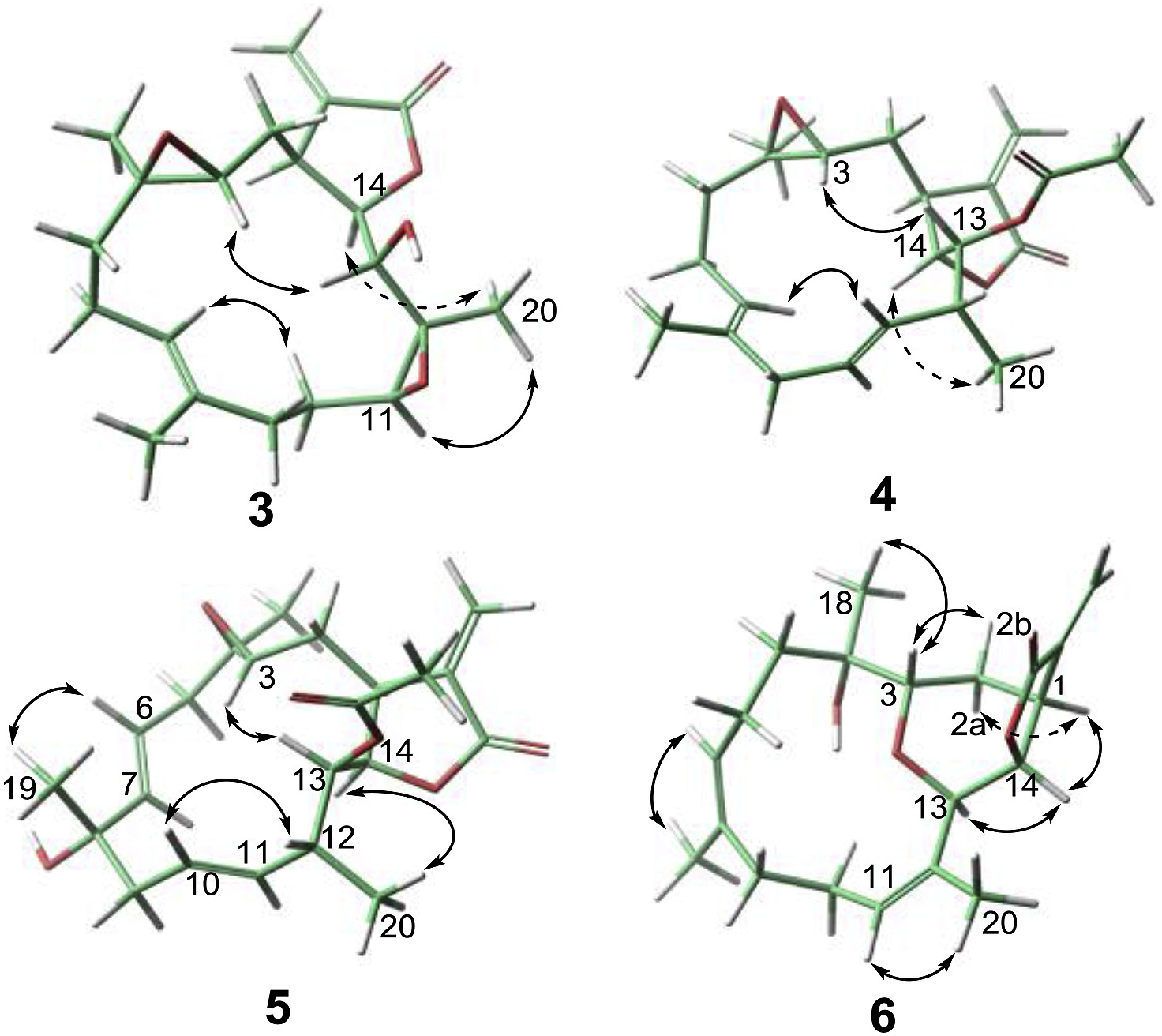 Red algae of Laurencia continue to provide wide structural diversity and complexity of halogenated C acetogenin medium-ring ethers. Here, we described the isolation of three new C acetogenins (3–5), and one truncated derivative (6) from Laurencia viridis collected on the Canary Islands. These compounds are interesting variations on the pinnatifidenyne structure that included the first examples of ethynyl oxirane derivatives (3–4). The structures were elucidated by extensive study of NMR (Nuclear Magnetic Resonance) data, J-based configuration analysis and DFT (Density Functional Theory) calculations. Their antiproliferative activity against six human solid tumor cell lines was evaluated.