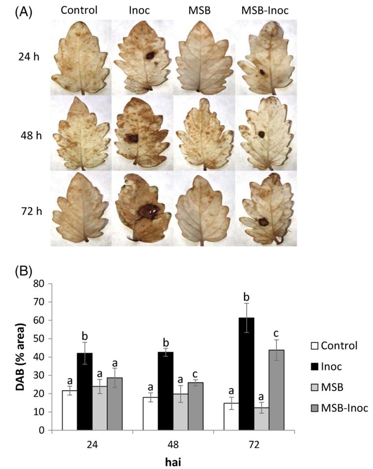 RESULTS Root treatment 48 h before inoculation with MSB 0.6 mmol L−1 reduced leaf lesion diameter by 30% and notably cell deaths, compared to control plants 72 h after inoculation. We studied the expression level of several pathogenesis-related (PR) genes from different defense transduction pathways, and found that MSB primes higher PR1 expression against B. cinerea. However, this stronger induced resistance was impaired in transgenic salicylic acid-deficient NahG line. Additionally, in the absence of pathogen challenge, MSB increased tomato plant growth by 28% after 10 days. Our data provide evidence that MSB protects tomato plants against B. cinerea by priming defense responses through the salicylic acid (SA)-dependent signaling pathway and reducing oxidative stress.