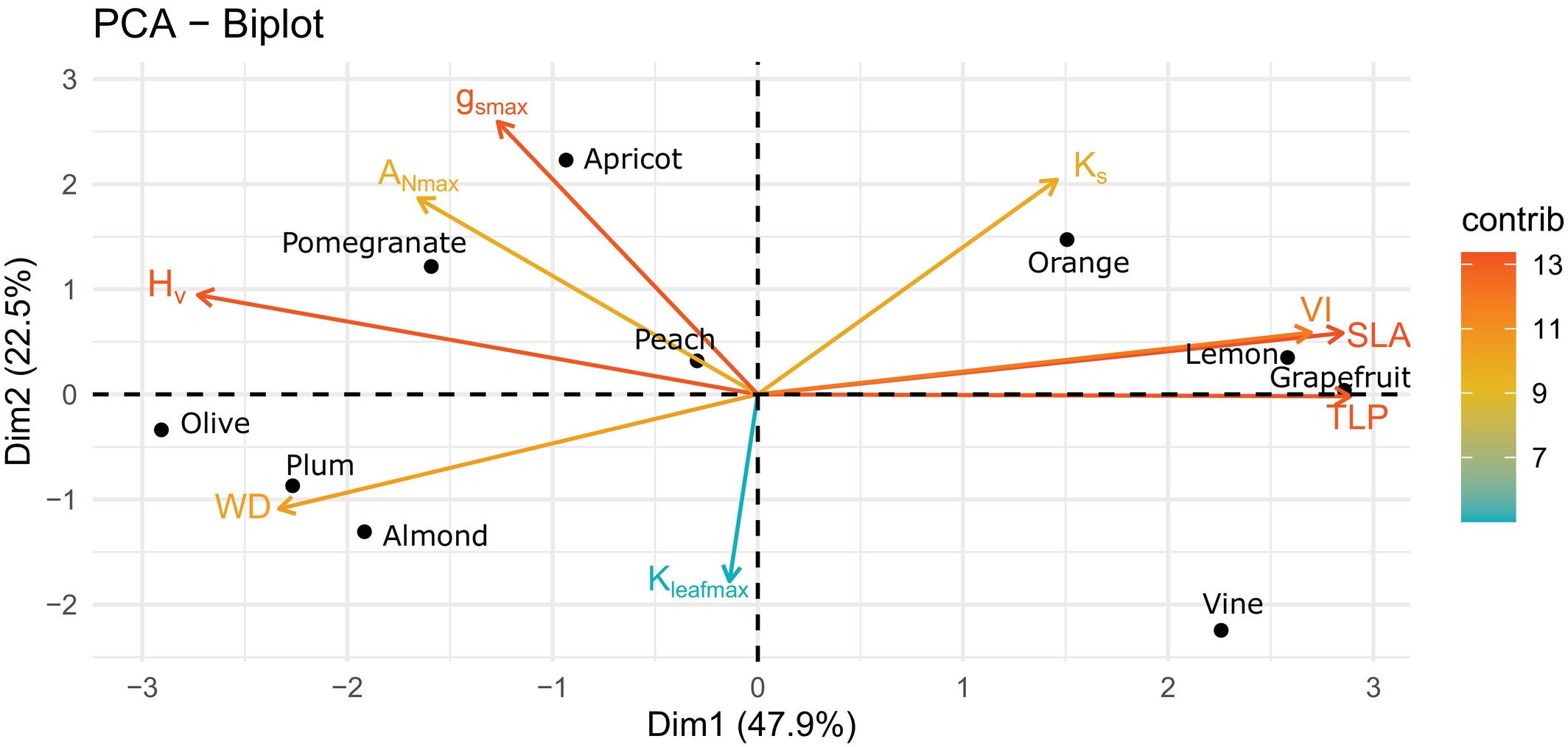 Crop plants, including fruit trees, are particularly vulnerable to water scarcity because past selection prioritized productivity over drought resistance, making it challenging to maintain productivity with minimal water use in the context of climate change. This study aims to determine which trait combination of 10 fruit tree species influences their water and carbon use, with the goal of understanding their adaptability to water scarcity. The results showed that water stress traits (turgor loss point, TLP; vulnerability index, VI), a carbon-related trait (specific leaf area; SLA), and a biomass allocation trait (Huber value; Hv) define the major axis of variability and present the strongest correlations with other traits. Two distinct strategies emerged: the first, mainly around Prunus species, was characterized by high Hv, low SLA, more negative TLP, and low VI, indicating greater water-stress tolerance due to sapwood redundancy and reduced organ vulnerability. They also exhibited higher maximum photosynthetic rates, indicating greater assimilation rates. The second strategy, mainly including Citrus species, exhibited opposite traits and trends. These trait combinations were likely shaped by shared ancestry and environmental factors. Understanding these correlations can guide irrigation practices and the selection of resilient species, contributing to more robust agricultural systems in a changing climate scenario.