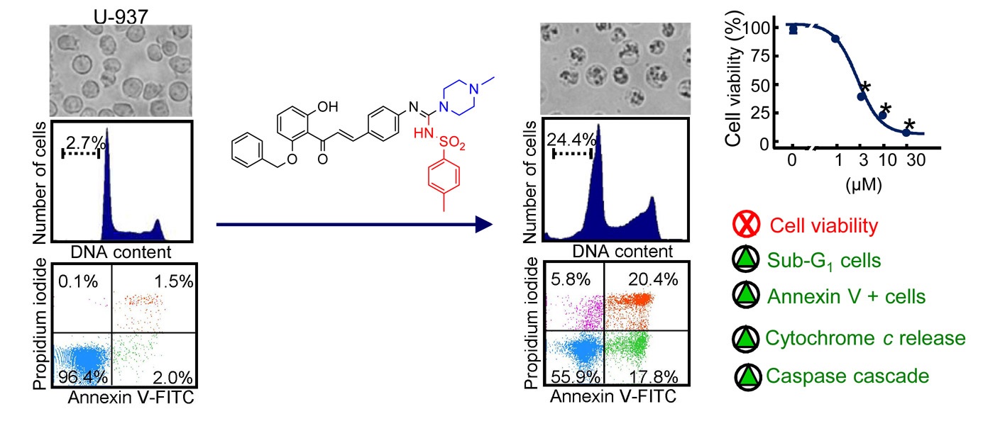 In this study, we investigated the effects of eleven synthetic guanidines containing the 1,3-diphenylpropenone core on the viabilities of six human cancer cells. The most cytotoxic compound against human cancer cells of this series contains a N-tosyl group and a N-methylpiperazine moiety 6f. It was cytotoxic against leukemia cells (U-937, HL-60, MOLT-3, and NALM-6) with significant effects against Bcl-2-overexpressing U-937/Bcl-2 cells as well as the human melanoma SK-MEL-1 cell line. It exhibited low cytotoxicity against quiescent or proliferating human peripheral blood mononuclear cells. The IC value for the leukemia U-937 cells was 1.6 ± 0.6 µM, a similar value to that in the antineoplastic agent etoposide. The guanidine containing a N-phenyl substituent 6i was also as cytotoxic as the guanidine containing the N-tosyl substituent and the N-methylpiperazine group 6f against human U-937 leukemia cells and both synthetic guanidines were potent apoptotic inducers. Cell death was mediated by the activation of the initiator caspase-9 and the executioner caspase-3, and associated with the release of cytochrome c. These synthetic guanidines are potent cytotoxic compounds against several human leukemia cells and even the human melanoma cell line SK-MEL-1 and might be useful in the development of new strategies in the fight against cancer.