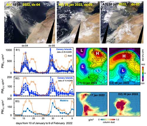 Unprecedented extreme Saharan dust (duxt) events have recently expanded northward from subtropical NW Africa to the Atlantic and Europe, with severe impacts on the Canary Islands, mainland Spain and continental Portugal. These six historic duxt episodes occurred on 3–5 and 22–29 February 2020, 15–21 February 2021, 14–17 January 2022, 29 January–1 February 2022, and 14–20 March 2022. We analyzed data of 341 governmental air quality monitoring stations (AQMSs) in Spain (330) and Portugal (11), where PM10 and PM2.5 are measured with European norm (EN) standards, and found that during duxt events PM10 concentrations are underestimated due to technical limitations of some PM10 monitors meaning that they can not properly measure extremely high concentrations. We assessed the consistency of PM10 and PM2.5 data and reconstructed 1690 PM10 (1 h average) data points of 48 and 7 AQMSs in Spain and Portugal, respectively, by using our novel “duxt-r” method. During duxt events, 1 h average PM10 and PM2.5 concentrations were within the range 1000–6000 µg m−3 and 400–1200 µg m−3, respectively. The intense winds leading to massive dust plumes occurred within meteorological dipoles formed by a blocking anticyclone over western Europe and a cutoff low located to the southwest, near the Canary Islands and Cape Verde, or into the Sahara. These cyclones reached this region via two main paths: by deviating southward from the Atlantic mid-latitude westerly circulation or northward from the tropical belt. The analysis of the 2000–2022 PM10 and PM2.5 time series shows that these events have no precedent in this region. The 22–29 February 2020 event led to (24 h average) PM10 and PM2.5 concentrations within the range 600–1840 and 200–404 µg m−3, respectively, being the most intense dust episode ever recorded on the Canary Islands. The 14–20 March 2022 event led to (24 h average) PM10 and PM2.5 values within the range 500–3070 and 100–690 µg m−3 in southeastern Spain, 200–1000 and 60–260 µg m−3 in central Spain, 150–500 and 75–130 µg m−3 in the northern regions of mainland Spain, and within the ranges 200–650 and 30–70 µg m−3 in continental Portugal, respectively, being the most intense dust episode ever recorded in these regions. All duxt events occurred during meteorological anomalies in the Northern Hemisphere characterized by subtropical anticyclones shifting to higher latitudes, anomalous low pressure expanding beyond the tropical belt and amplified mid-latitude Rossby waves. New studies have reported on recent record-breaking PM10 and PM2.5 episodes linked to dipole-induced extreme dust events from North Africa and Asia in a paradoxical context of a multidecadal decrease in dust emissions, a topic that requires further investigation.