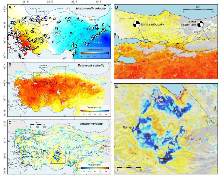 Measurements of present‐day surface deformation are essential for the assessment of long‐term seismic hazard. The European Space Agency's Sentinel‐1 satellites enable global, high‐resolution observation of crustal motion from Interferometric Synthetic Aperture Radar (InSAR). We have developed automated InSAR processing systems that exploit the first ~5 years of Sentinel‐1 data to measure surface motions for the ~800,000 km2 Anatolian region. Our new 3D velocity and strain rate fields illuminate deformation patterns dominated by westward motion of Anatolia relative to Eurasia, localized strain accumulation along the North and East Anatolian Faults, and rapid vertical signals associated with anthropogenic activities and to a lesser extent extension across the grabens of western Anatolia. We show that automatically processed Sentinel‐1 InSAR data can characterize details of the velocity and strain rate fields with high resolution and accuracy over large regions. These results are important for assessing the relationship between strain accumulation and release in earthquakes.