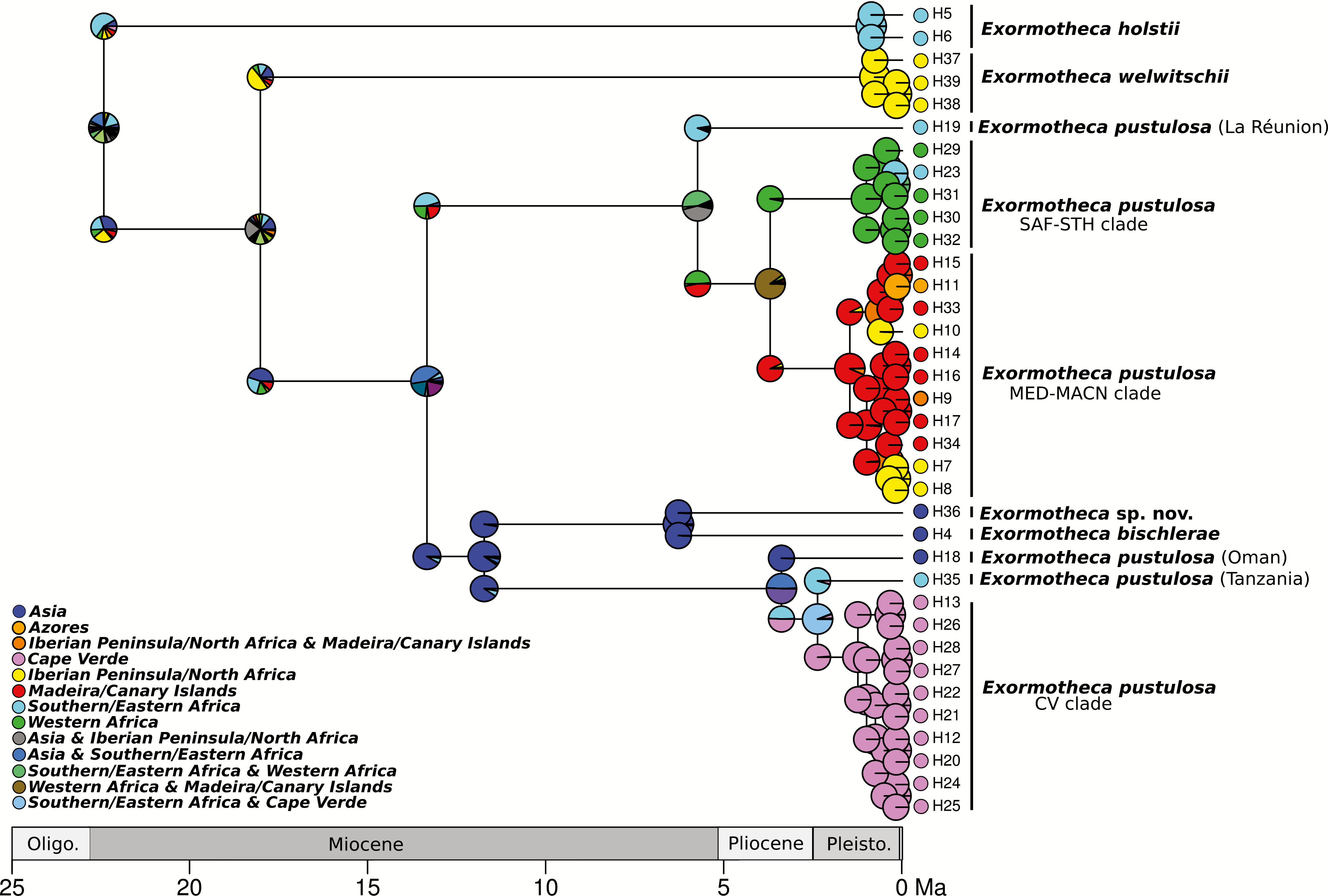 The ‘Rand flora’ is a biogeographical disjunction which refers to plant lineages occurring at the margins of the African continent and neighbouring oceanic archipelagos. Here, we tested whether the phylogeographical pattern of Exormotheca pustulosa Mitt. was the result of vicariance induced by past climatic changes or the outcome of a series of recent long-distance dispersal events. Two chloroplast markers (rps4-trnF region and psbA-trnH spacer) and one nuclear marker (ITS2) were analysed. Phylogenetic and phylogeographical relationships were inferred as well as divergence time estimates and ancestral areas. Exormotheca possibly originated in Eastern Africa during the Late Oligocene/Early Miocene while Exormotheca putulosa diversified during the Late Miocene. Three main E. pustulosa groups were found: the northern Macaronesia/Western Mediterranean, the South Africa/Saint Helena and the Cape Verde groups. The major splits among these groups occurred during the Late Miocene/Pliocene; diversification was recent, dating back to the Pleistocene. Climate-driven vicariance and subsequent long-distance dispersal events may have shaped the current disjunct distribution of E. pustulosa that corresponds to the Rand Flora pattern. Colonization of Macaronesia seems to have occurred twice by two independent lineages. The evolutionary history of E. pustulosa populations of Cape Verde warrants further study.