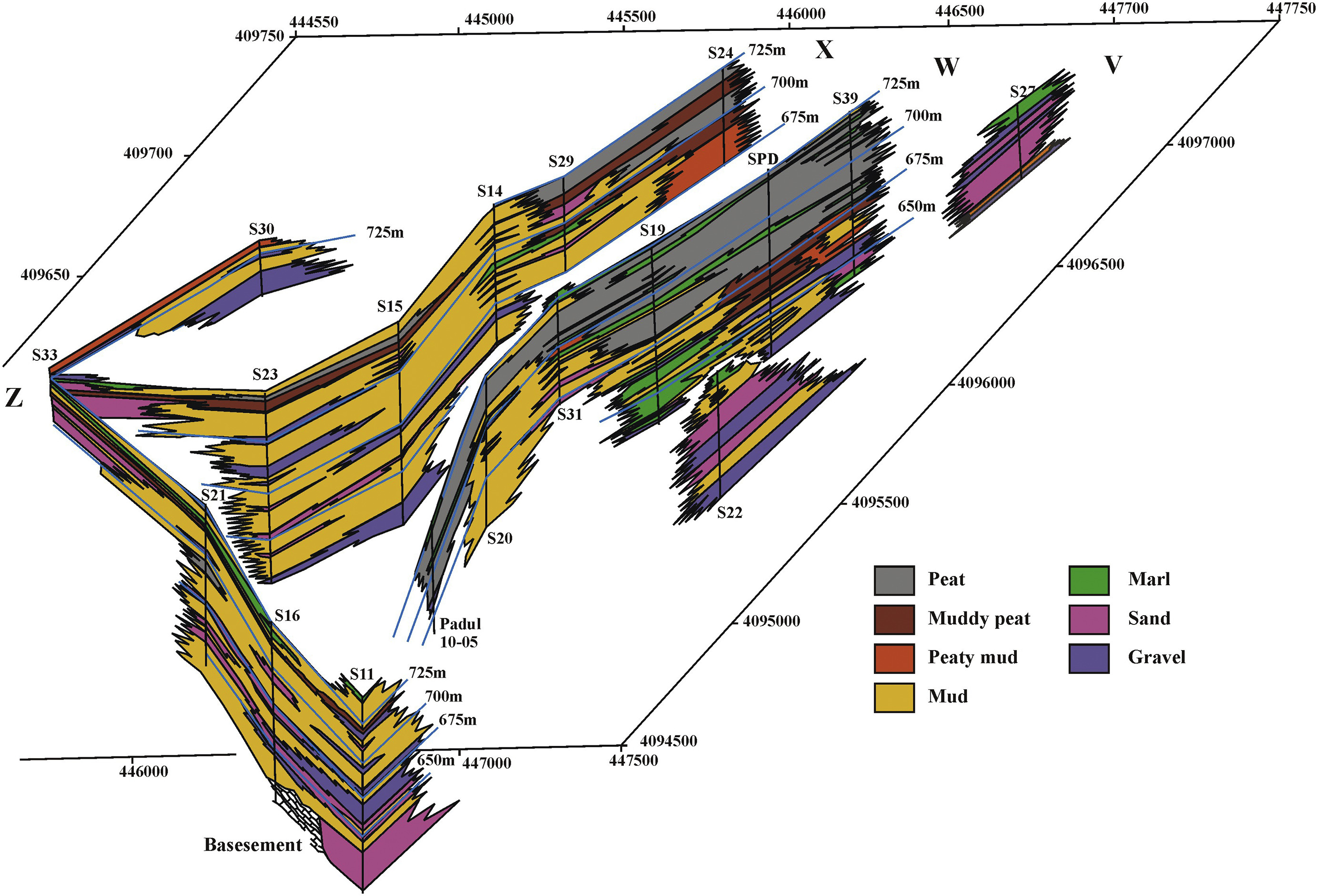A multiproxy study based on sedimentology, mineralogy, magnetic susceptibility, organic geochemistry and fossil content allowed to establish the sedimentary evolution of palustrine basins and to study the interplay between tectonic and climatic forcings in the sedimentation and facies arrangement that can be extrapolated to other coal-bearing basins. The reinterpretation of the data from 18 cores allowed to determine the facies distribution and to model the sedimentary evolution of the Padul Basin, with the longest continuous continental Quaternary record in the Southwestern Mediterranean region. The Padul Basin sediment record and facies successions provide an outstanding example of tectonically and environmentally controlled sedimentation. The sedimentary characteristics of the cores and thickness distribution revealed that recent tectonics was a more important forcing than other processes (e.g. climate). The influence of recent tectonics was determinant in facies arrangement, that is to say that the activity of a rotated fault produced a differential subsidence, causing more than 100 m of palustrine deposits to stack. On the basis of the sedimentological record combined with data on the mineralogy, fossil content, magnetic susceptibility and total organic carbon, three main sedimentary units were identified, linked to diverse subsidence rates and paleoenvironmental oscillations. The magnetic susceptibility was likely to have been controlled by the organic matter content (TOC values), linked to oxic/anoxic conditions. In the lower part of the record, Unit A (107.0–68.7 m), shallow lacustrine conditions were dominant, with an important influx associated with considerable runoff from active alluvial fans, linked to a higher subsidence rate. Unit B (68.7–37.6 m) had a transitional character, with a considerable decrease in the influence of the alluvial fan system. The lake recharge through overland flow markedly diminished and pre-existing groundwater recharge was dominant. A sudden change to peaty materials indicated that surface runoff was directly diverted to the recently excavated Dúrcal River gorge, thereby precluding the basin from becoming a swampy environment with stagnant waters. Unit C (upper 37.6 m) was almost exclusively fed by bicarbonate groundwater and subsurface runoff through the highly permeable coarse alluvial fan deposits. Within these main sedimentary units, minor mud-peat shallowing-upward sequences were identified