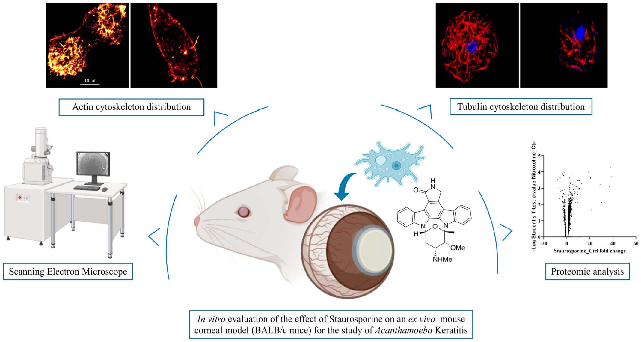 Acanthamoeba is a ubiquitous genus of amoebae that can trigger a severe and progressive ocular disease known as Acanthamoeba Keratitis (AK). Furthermore, current treatment protocols are based on the combination of different compounds that are not fully effective. Therefore, an urgent need to find new compounds to treat Acanthamoeba infections is clear. In the present study, we evaluated staurosporine as a potential treatment for Acanthamoeba keratitis using mouse cornea as an ex vivo model, and a comparative proteomic analysis was conducted to elucidate a mechanism of action. The obtained results indicate that staurosporine altered the conformation of actin and tubulin in treated trophozoites of A. castellanii. In addition, proteomic analysis of treated trophozoites revealed that this molecule induced overexpression and a downregulation of proteins related to key functions for Acanthamoeba infection pathways. Additionally, the ex vivo assay used validated this model for the study of the pathogenesis and therapies of AK. Finally, staurosporine eliminated the entire amoebic population and prevented the adhesion and infection of amoebae to the epithelium of treated mouse corneas.
