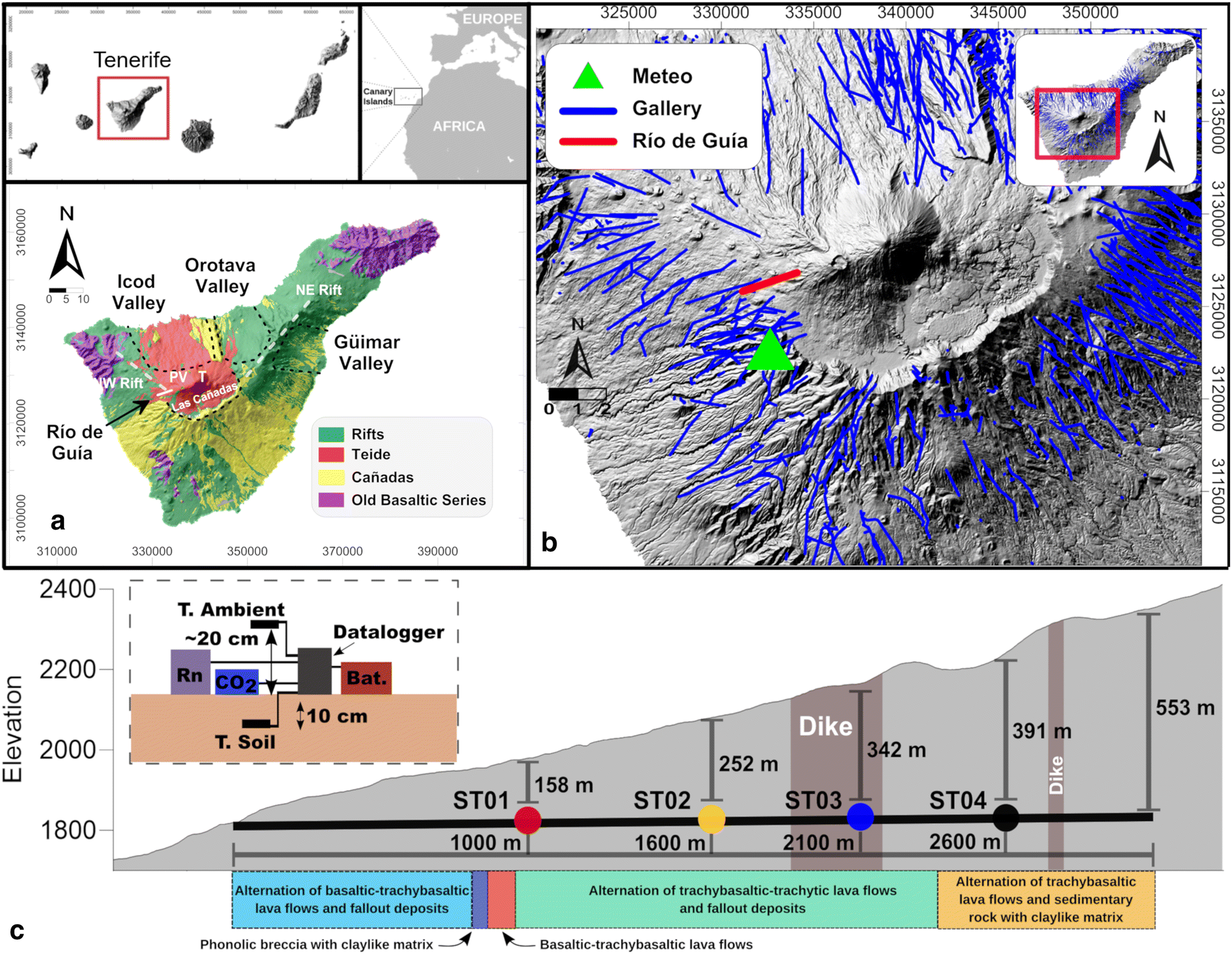 In Tenerife there are a vast number of sub-horizontal blind water mines, called “galleries”. Seven air and soil temperatures and CO2 concentration profiles in air were carried out inside the Río de Guía gallery (hereinafter RdG). An anomalous stable maximum temperature point (hereinafter MTP) was found around 2000 m from the entrance. During the warm period, a clear CO2 stagnation was detected before MTP, showing concentrations up to 14,000 ppm. In order to study gas emission and its dynamics inside the gallery, four stations were deployed around MTP. All stations recorded air and soil temperatures, and CO2 and Rn concentration in air from November 2009 to January 2011. After analyzing this dataset, it was possible to characterize the influence of MTP. This thermal anomaly divided the gallery into two sections. In the cold period, the outer section located outwards from MTP became colder while the inner section warmed up owing to a less heat transfer into the deepest part of the gallery. There were several short periods when variations in barometric pressure created an advection movement that was able to temporally change the gas behavior inside the gallery. Two soil gas samples were taken around MTP and their δ13C (CO2) ratios suggested a magmatic origin. All data were combined to create a model for the gas and thermal dynamics inside the gallery. This model, together with identification of background levels in each parameter, allows to identify any anomalous signal that could be elated with changes in volcanic activity.
