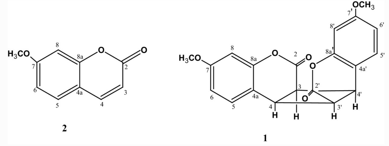 Dimer of herniarin (1) together with herniarin (2), scopoletin (3), and (2E,4E)-6-(2-thienyl)-2,4-hexadienisobutylamide (4) were isolated from the flowers of Matricaria pubescens. Their structures were established by spectroscopic data and by comparison with spectral data of known compounds. Compound 1 is reported for the first time in plant kingdom, and compound 3 is reported from M. pubescens for the first time.