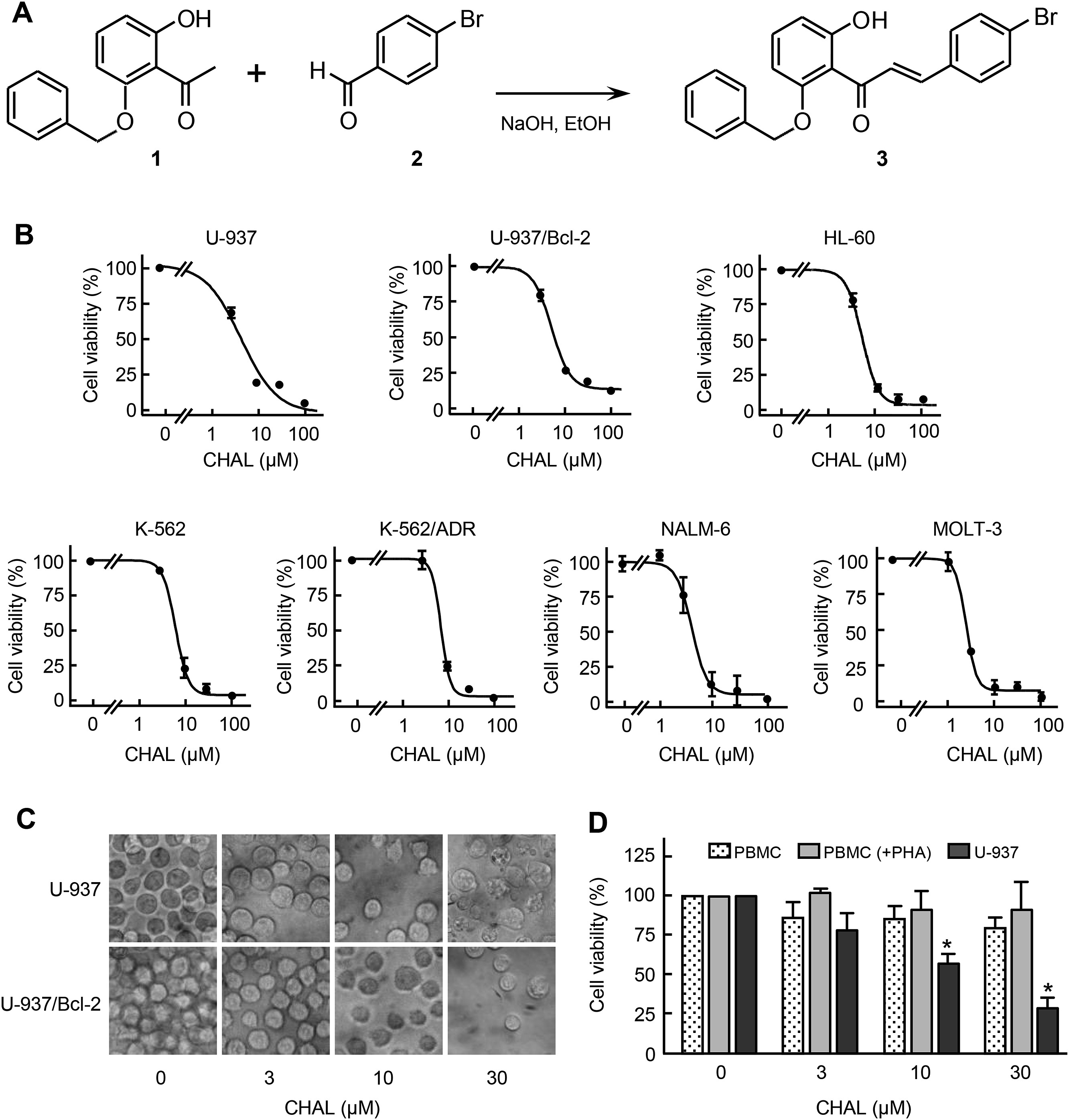 In this study, we investigated the effects of synthetic 6′-benzyloxy-4-bromo-2′-hydroxychalcone on viabilities of seven human leukaemia cells. It was cytotoxic against U-937, HL-60, K-562, NALM-6, MOLT-3 cells, and also against Bcl-2-overexpressing U-937/Bcl-2 cells and P-glycoprotein-overexpressing K-562/ADR, but had no significant cytotoxic effects against quiescent or proliferating human peripheral blood mononuclear cells. This chalcone is a potent apoptotic inducer in human leukaemia U-937 cells. Cell death was (i) mediated by the activation and the cleavage of initiator and executioner caspases and poly(ADP-ribose) polymerase; (ii) prevented by the pan-caspase inhibitor z-VAD-fmk, and by the selective caspase-3/7, −6 and −8 inhibitors, and by a cathepsins B/L inhibitor; (iii) associated with the release of mitochondrial proteins, including cytochrome c and Smac/DIABLO; (iv) accompanied by dissipation of the mitochondrial membrane potential, (v) partially blocked by the inhibition of p38 and (vi) mostly abrogated by catalase. In conclusion, the synthetic chalcone is cytotoxic against several types of human leukaemia cell with apoptosis being induced by activation of the extrinsic pathway and the generation of reactive oxygen species.