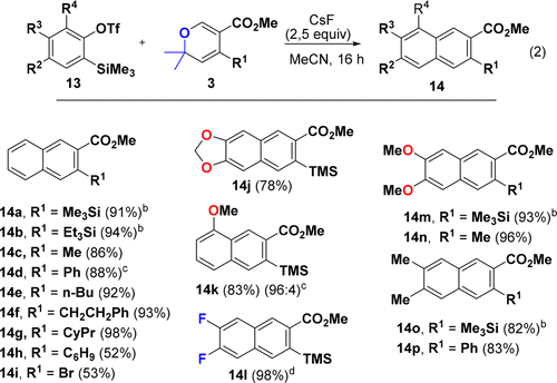 The practical use of 2,2-dimethyl-2H-pyrans as electron-rich dienes in sequential Diels−Alder/retro-Diels−Alder (DA/rDA) domino processes to generate aromatic platforms has been demonstrated. Different polysubstituted alkyl 2-naphthoates have been synthesized by the DA/rDA reaction of benzynes and 2,2-dimethyl-2H-pyrans. The use of other activated alkynes allows the access of substituted alkyl benzoate derivatives.